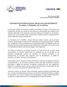 También la CEDHNL señaló que, debido a la reconducción del presupuesto 2025 y la falta de recursos adicionales, no ha podido aplicar el incremento salarial por inflación a sus 130 trabajado -