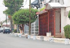los números 3500 y 3584, se observaron botes con concreto y una base circular de cemento con un tubo metálico al centro, instalados de forma permanente.