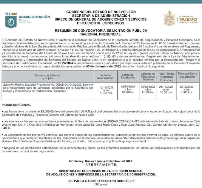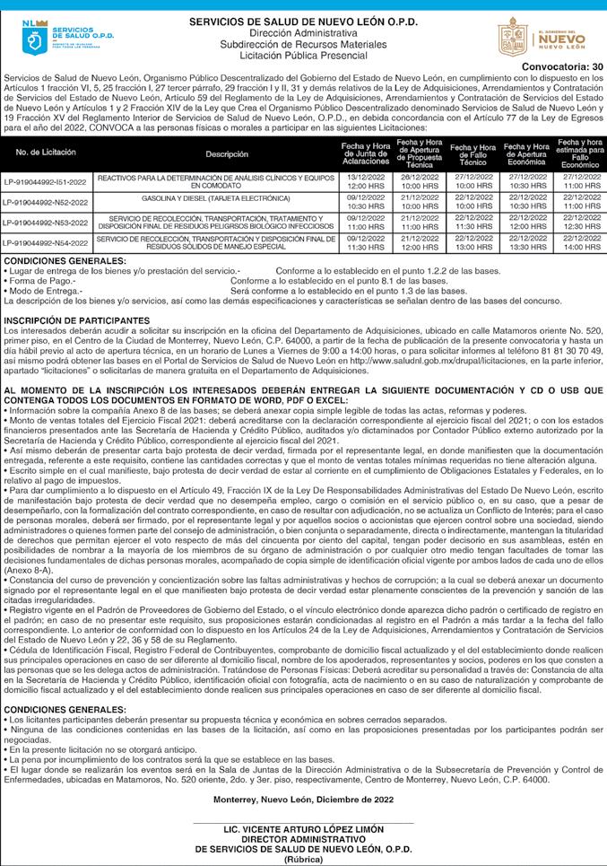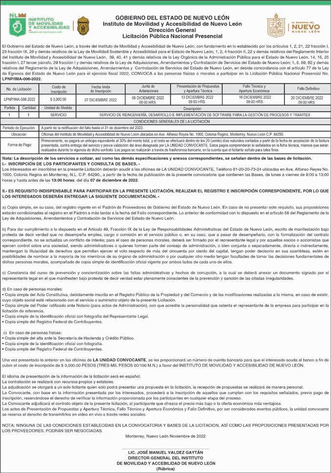 En el Juzgado Quinto de lo Civil del Primer Distrito Judicial en el Estado, dentro de los autos del expediente judicial número 1132/2016, relativo al juicio ordinario civil, promovido por Instituto del Fondo Nacional de la Vivienda para los Trabajadores –INFONAVIT-, por conducto de su representante legal, en contra de José Juan Córdova Cardona y Mónica Abril Flores Valencia, por auto dictado el 7 siete de octubre de 2022 dos mil veintidós se ordenó sacar a la venta en pública subasta y primera almoneda, el siguiente bien inmueble objeto de la garantía hipotecaria señalada en el contrato base de la acción, consistente en: Lote de terreno marcado con el número 33 treinta y tres de la manzana 205 doscientos cinco del Fraccionamiento Colinas del Aeropuerto, Segunda Etapa, ubicado en el Municipio de Pesquería, Nuevo León, el cual tiene una superficie de 90.00 M2 noventa metros cuadrados, con las siguientes medidas y colindancias: al ESTE, mide 6.00 seis metros y colinda con lote 20 veinte, al OESTE mide 6.00 seis metros y da frente a la calle San Pedro; al SUR, mide 15.00 quince metros y colinda con el lote 32 treinta y dos, al NORTE, mide 15.00 quince metros y colinda con lote 34 treinta y cuatro. La manzana se encuentra circundada por las siguientes calles: al ESTE, con Santa Catarina; al OESTE, San Pedro, al SUR, Galeana y al NORTE, con Escobedo. Dicho inmueble tiene como mejoras la finca marcada con el número 1939 (mil novecientos treinta y nueve), de la calle San Pedro, del citado fraccionamiento, ubicado en el municipio de Pesquería, Nuevo León. Dicho inmueble se encuentra inscrito bajo los siguientes datos: número 4609, volumen 75, libro 185, sección Propiedad, unidad Pesquería, del 2 dos de septiembre de 2009 dos mil nueve. Sirviendo como Postura Legal la cantidad de $208,666.66 (doscientos ocho mil seiscientos sesenta y seis pesos 66/100 moneda nacional) que corresponde a las dos terceras partes del avalúo rendido por el perito de la parte actora, el cual asciende a la cantidad de $313,000.00 (trescientos trece mil pesos 00/100 moneda nacional). Venta que deberá anunciarse 2 dos veces una cada tres días, fijándose edictos en la tabla de avisos de este juzgado, y tomando en consideración que el valor del citado inmueble pasa de las cincuenta cuotas, con la finalidad de dar cumplimiento a lo ordenado en el artículo 468 del ordenamiento procesal en consulta, publíquense edictos en el Boletín Judicial del Estado, y en un periódico de los de mayor circulación que se edita en la ciudad como lo son el Porvenir, Milenio Diario, el Norte o Periódico ABC. Al efecto, esta autoridad tiene a bien autorizar el desahogo de la audiencia de remate en comento, mediante audiencia a distancia, con la comparecencia personal de las partes y postores que deseen comparecer a través de videoconferencia, señalándose para ello las 12:00 doce horas del 9 nueve de diciembre de 2022 dos mil veintidós, habilitándose el uso de las herramientas tecnológicas necesarias para tal fin, ello en términos de lo previsto en los artículos 3, 4, 5, 6, 7, 8 y 10 del Acuerdo General Conjunto 8/2020-II y demás relativos, en relación con el acuerdo 13/2020-II, así como del ordinal 468 del Código de Procedimientos Civiles del Estado de Nuevo León. Asimismo, es importante hacer del conocimiento de las partes y postores, que para intervenir en la audiencia de remate señalada a través de videoconferencia, deberán contar con un dispositivo electrónico que permita la trasmisión de audio y video vía internet. Asimismo, las partes deberán proporcionar a la secretaría del juzgado a mi cargo, una dirección de correo electrónico para crear el enlace respectivo. Esto último se deberá realizar con por lo menos 3 tres días antes de la celebración de la audiencia a través de esta vía. En caso de que alguna de las partes o postores no cuente con lo anterior, tiene la opción de comparecer, junto a su abogado, vía remota en la sala de audiencias de este juzgado, en donde se les proporcionará un equipo de cómputo para llevar la conexión con la otra parte y personal del juzgado que llevará a cabo la audiencia a distancia. Lugar ubicado en la calle Matamoros número 347, esquina con Pino Suárez, en la zona centro de Monterrey, Nuevo León; en donde se garantizará que se cumplan estrictamente las medidas y recomendaciones del sector salud relacionadas con el virus SARS-CoV2 (COVID-19); y se contará, además, con filtros sanitarios con toma de temperatura corporal y aplicación de gel antibacterial al ingreso, sanitización del lugar, cuidado de la sana distancia de uno punto cinco metros y uso de cubre bocas obligatorio. En el supuesto de que alguna de las partes o postores no cuente con el equipo tecnológico necesario para llevar a cabo la audiencia vía videoconferencia, deberá informarlo ante esta autoridad bajo protesta de decir la verdad, cuando menos 3 tres días hábiles previos a la fecha programada para el desahogo de la audiencia, para efecto de que se le proporcionarle el equipo necesario para llevarla a cabo, bajo el apercibiendo de que una vez transcurrido dicho plazo y no haber hecho manifestación alguna, quedaran obligados a incorporarse a la audiencia a distancia programada desde una sede virtual con sus propios medios, lo anterior en términos del artículo 8 del Acuerdo General Conjunto 10/2020-II y 13/2020-II, de los Plenos del Tribunal Superior de Justicia y del Consejo de la Judicatura de la Judicatura del Estado. En la inteligencia, de que se recomienda a los postores por cuestiones de logística dada la situación que vivimos, que preferentemente cualquier documento que deseen o deban presentar en relación a la audiencia (tales como documento con el que justifiquen su personalidad, certificados de depósito o cualquiera otra constancia adecuada al caso en particular), sean allegados físicamente con 3 tres días de anticipación a la celebración de la fec