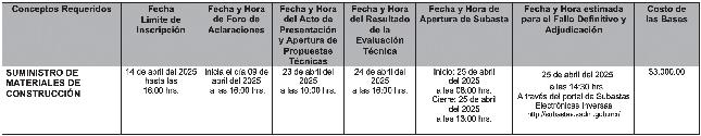 Descentralizada Denominada Servicios de Agua y Drenaje de Monterrey, así como las facultades que me fueron conferidas en el testimonio de la Escritura Pública No. 5,804, de fecha 04 de diciembre de 2024, otorgada ante la fe del Notario adscrito a la Notaria Pública No. 13, Dr. Mauricio Alfonso Morales Aldape, con ejercicio en la Ciudad de Monterrey, Nuevo León, registrado ante el Instituto Registral y Catastral del Estado de Nuevo León bajo el No. 7,790, Volumen 153, Libro 312, presentado en fecha 11 de diciembre de 2024, signado por el Arq. Juan Ignacio Barragán Villarreal, Director General de Servicios de Agua y Drenaje de Monterrey, I.P.D., en debida concordancia con el artículo 77 de la Ley de Egresos del Estado de Nuevo León para el ejercicio fiscal 2025, publicada en el Periódico Oficial del Estado de Nuevo León, el día 18 de febrero del 2025 y demás relativos y aplicables de las leyes antes citadas, contando con la aprobación y supervisión tecnológica para administrar el portal de Subastas Electrónicas Inversas según oficio emitido en fecha 04 de junio del 2012 por la Secretaría de Finanzas y Tesorería General del Estado, CONVOCA a las personas Físicas y Morales mexicanas que tengan interés en participar en las siguientes Subastas. SUBASTA ELECTRÓNICA INVERSA No. SADM-GCS-CO-014/2025