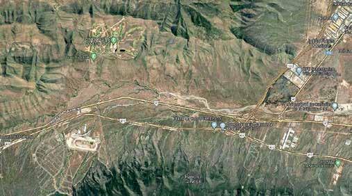 Versiones señalan que la planta de Tesla se ubicaría en la zona del circulo amarillo, muy cerca del club de golf Terralta (1) y de la caseta de cobro de la carretera Monterrey-Saltillo (2) Foto: Especial