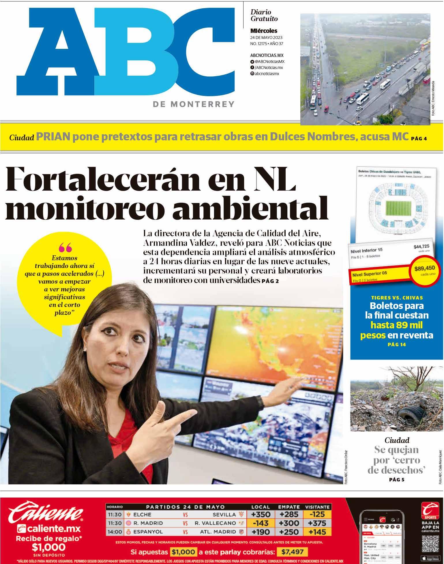 Gonzalo Estrada Cruz (†) Fundador Alberto Estrada Torres Presidente del Consejo de Administración Gonzalo Estrada Torres Vicepresidente del Consejo de Administración Alberto D. Estrada Hernández Director General Gonzalo I. Estrada Sáenz Director Corporativo de Relaciones Institucionales Juan Antonio Martínez Director Editorial Claudia Osuna Cedillo Director Comercial Enrique Trujillo Alvarez Director de Infraestructura Eduardo Garza Hinojosa Gerente de Relaciones Institucionales Año 37. No. 12175 24 de Mayo de 2023 ABC es una publicación, de impresión y distribución diaria de Editorial Monterrey, S.A. Oficinas y Talleres: Platón Sánchez 411 Sur, Monterrey, N.L. Apartado M-19 C.P. 64000 Tel: 8047-4900 Oficinas en CDMX: Leibintz 231, Col. Anzures México, CDMX C.P. 11590 Delegación Miguel Hidalgo Tel: 8047-4900 Número de Certificado de Reserva otorgado por el Instituto Nacional del Derecho de Autor 04-2011020413033200-101 Fundado el 15 de Junio de 1985. Certificado de Licitud de Título y Contenido No. 15281 otorgado con fecha veintidós de julio de dos mil once por la Comisión Calificadora de Publicaciones y Revistas Ilustradas de la Secretaría de Gobernación. Los conceptos vertidos por los editorialistas son bajo su propia responsabilidad y no reflejan el sentir de este periódico. Ventas de Publicidad y Maquilas: 8047- 4900 Ext. 2225 ventasabc@epsilonmedia.mx Award of Excellence of the 39th Edition Best of News Design Creative Competition Circulación certificada por el Instituto Verificador de Medios Registro No. 493/08