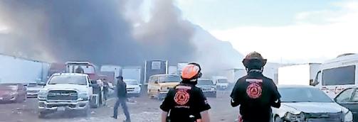 CUERPOS DE EMERGENCIA se movilizaron al municipio de Juárez para auxiliar en un incendio en un corralón de vehículos que provocó que entre 80 y 90 unidades resultaran consumidas por el fuego dentro de un terreno utilizado para el resguardo de automóviles.