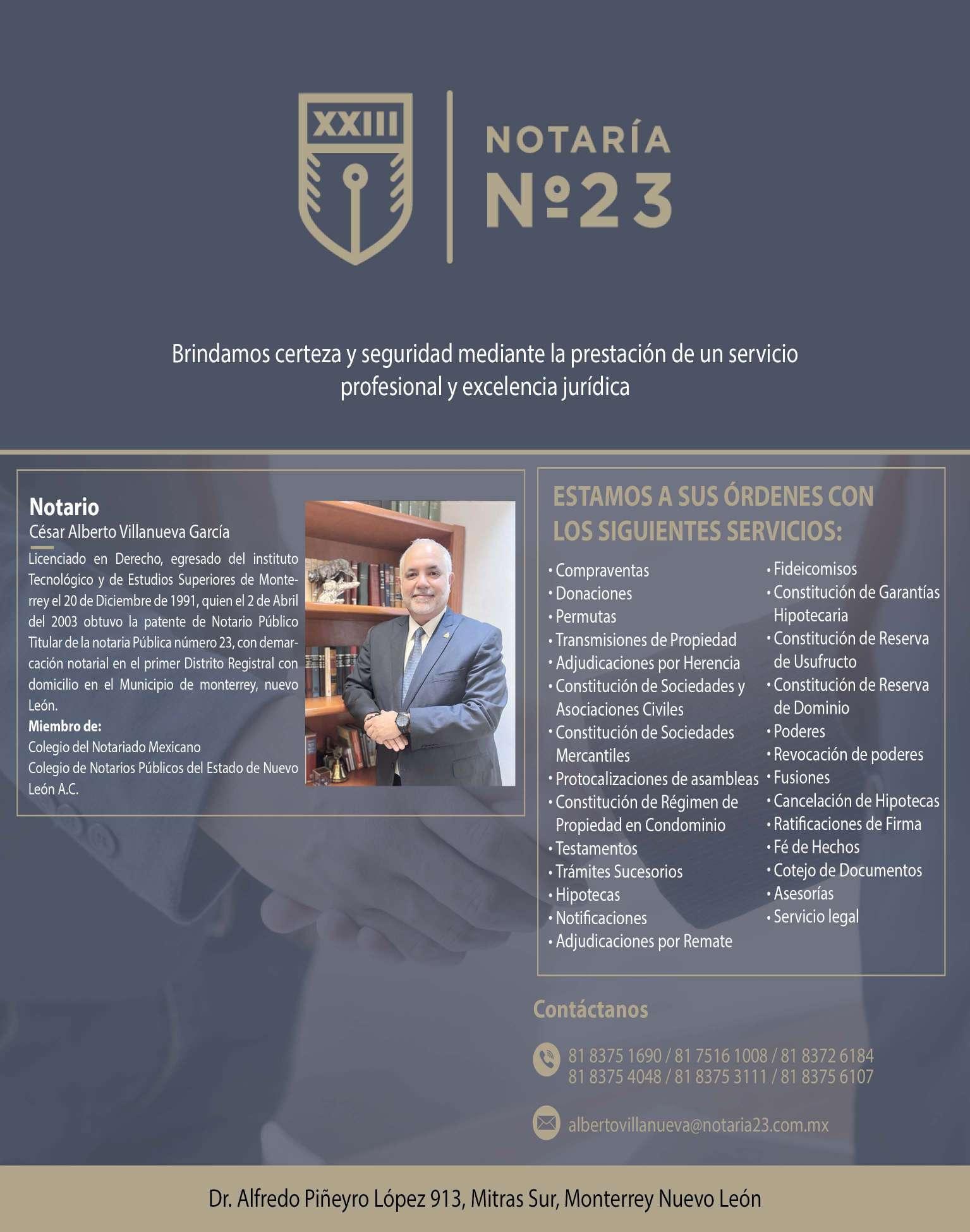 Lunes a Viernes de 9:00 am a 2:00 pm y 3:30 pm a 7:00 pm Canadá #520 Col. Vista Hermosa, Monterrey, N.L. Tel: 81 8346 4649 y 81 8348 8196. Correo: notario@notaria8nl.mx - SERVICIOS• Contratación Inmobiliaria • Poderes y Cartas-Permiso • Fideicomisos • Testamentos • Ratificación de Firmas • Cotejo de Documentos • Consultoría Jurídica • Constitución de Sociedades