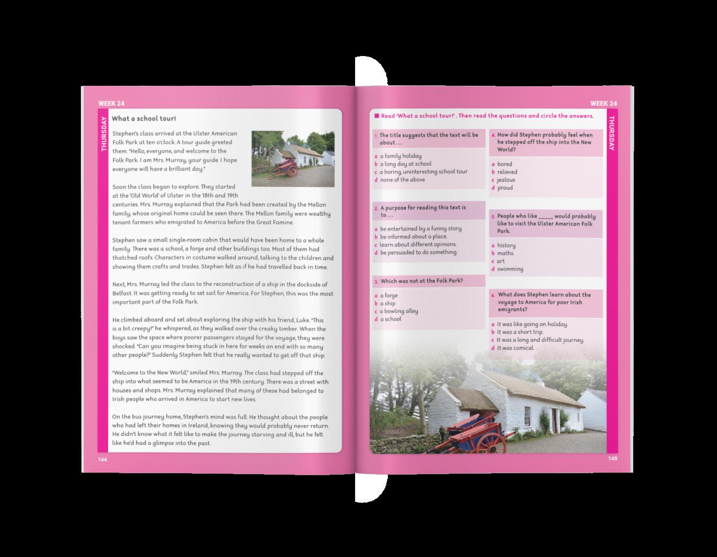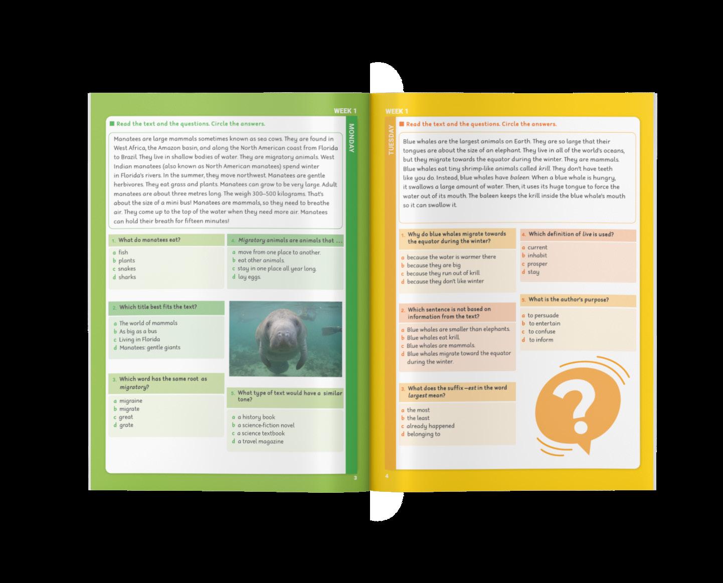 Days 1–3: Short texts with questions that develop comprehension, vocabulary and language skills