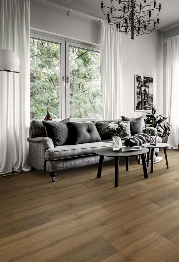 Vår expertis återspeglas i ytbeläggningen: Genom en naturlig struktur, framhävda kvistar med synkroniserad prägling och en matt yta skapar vi en naturlig känsla som påminner om oljade trägolv. Samtidigt ger vårt innovativa keramiska ytskikt enastående motståndskraft.
