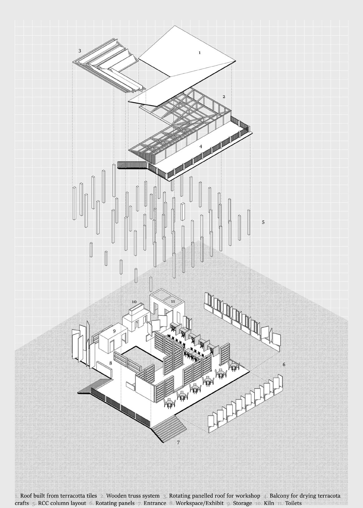 ranks low in literacy, making it the perfect place for the construction of a small library that would contribute to the development of the village. The idea behind the design was not only to provide a space for education, but a safe working and storage space for the villagers’ crafts. The site is located in the densest part of the village just infront of the school and a few meters away from the Terracotta musem. The library consists of reading spaces, computers, a working space with a kiln, storage spaces and a balcony to dry the terracotta crafts.
