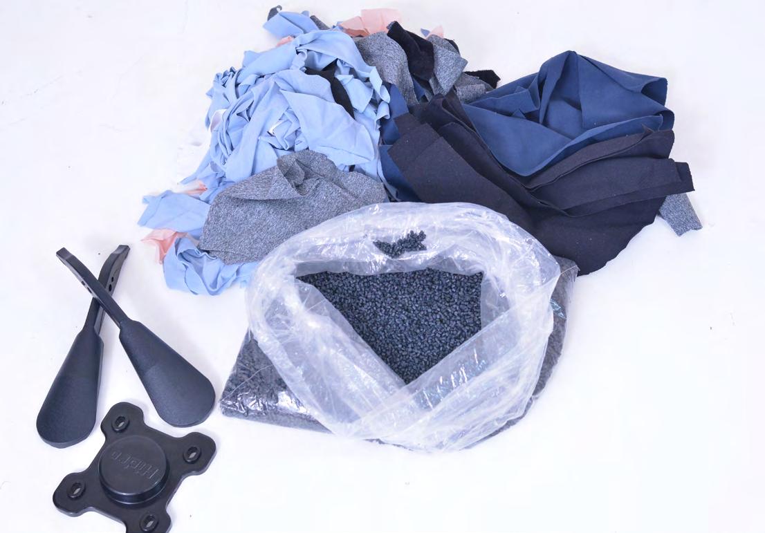 Resíduos têxteis sintéticos (poliamida e poliéster) transformados em pellets usados na injeção de peças como adereços de calçados e fechos de segurança.