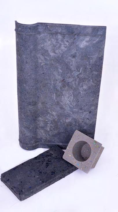 os resíduos e peças de vestuário pós-consumo são transformados em uma massa polimérica usada na produção de peças plásticas como tábuas, telhas, pisos, etc