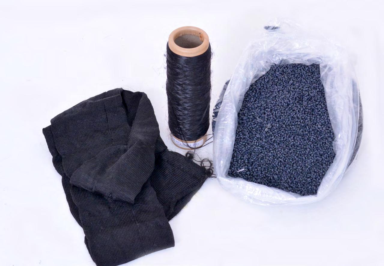 os resíduos de poliéster, poliéster com elastano, e poliamida com elastano são transformados em pellets para serem usados como matéria-prima no processo de injeção de peças plásticas.