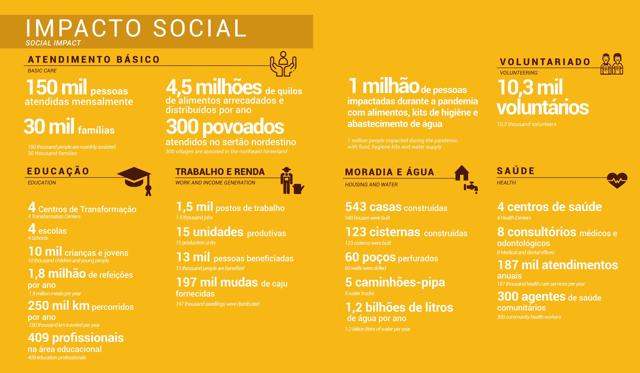 de e atividades culturais. Fornecemos ônibus escolar que rodam muito, como buscar uma criança que às vezes mora a 30 km. Damos merenda, material, uniforme. Cerca de 10 mil crianças, jovens e adultos vão diariamente aos Centros. A gente vai de casa em casa, percorremos Quilombos, somando milhares de quilômetros todos os meses para poder trazer essas crianças para escola porque nós acreditamos que, somente através da educação é que nós vamos ter um país transformado, onde as pessoas são livres do analfabetismo e vislumbrem um futuro.