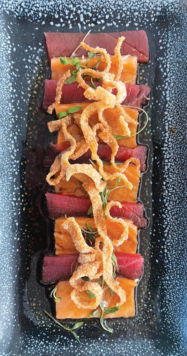 TIRADITO DE ATÚN Y SALMÓN CON PONZU DE MARACUYÁ ACEVICHADA Y RISOS DE WANTON FRITO