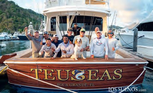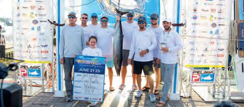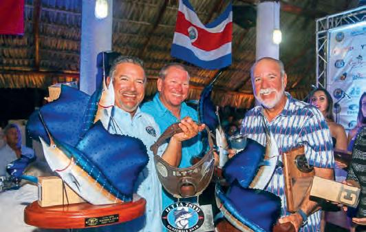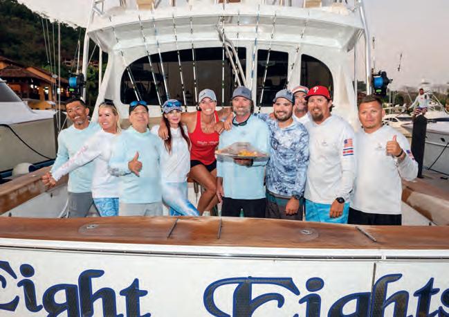PRIMER LUGAR: "Uno Mas", un Bayliss de 60' capitaneado por su dueño/ esposo Brooks Smith. Pescadoras María Smith y Yendry Zúñiga Jiménez. “Uno Mas” ocupó el primer lugar en el evento de tres etapas con 5.100 puntos en total, incluidas 11 velas y 8 marlines.