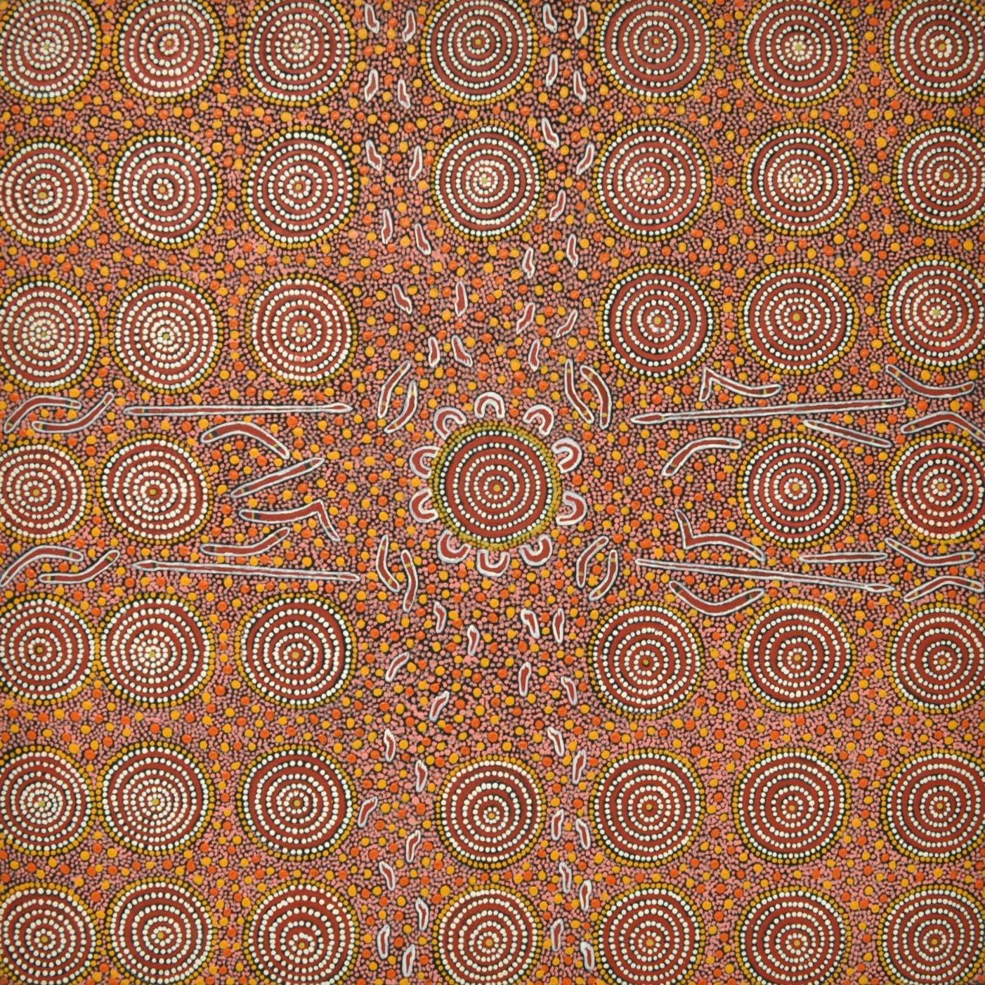 Tjakamarra Kutjarra is a series of contrast and mutuality. Both Dennis Tjakmarra Nelson and Simon Tjakamarra Yuungut have a significant inheritance from independent Tjupurrula fathers. Fathers who pioneered the Western Desert Art Movement. Intergenerational knowledge is the ground, the stylistic contrast reinvigorates Tjukurrpa (Dreaming), identity, perception and the individual in unity.