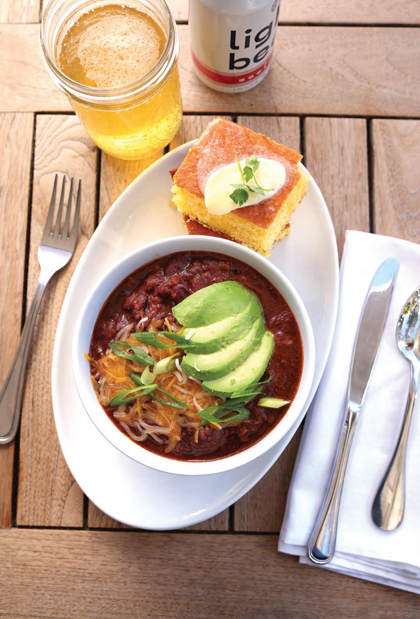 Brandt ground beef and sirloin flap, kidney beans, onions, housemade bone broth, cherry tomatoes, tomato paste, and spices garnished with avocado, shredded Monterey jack cheese, and green onions