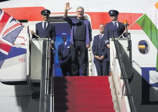 Prime Minister Keir Starmer waves as he departs from his visit to India