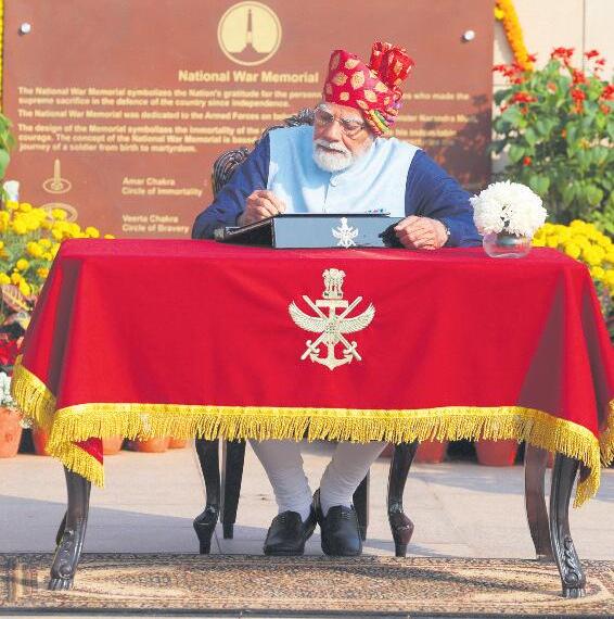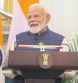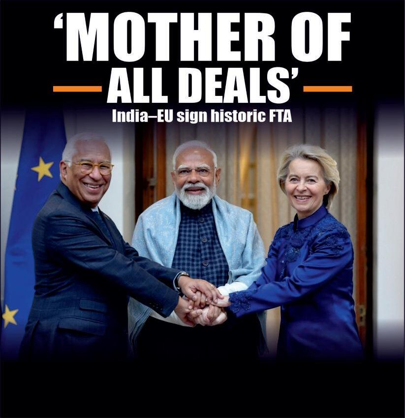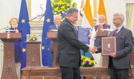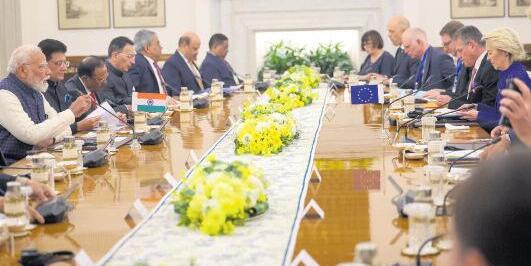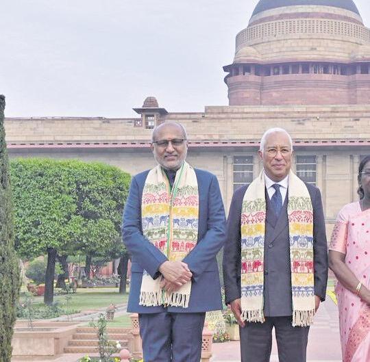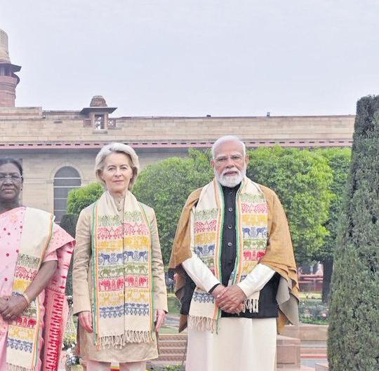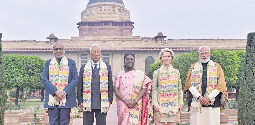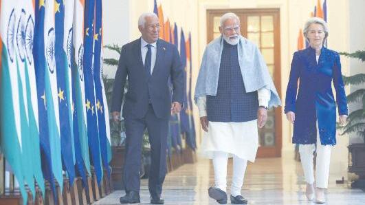 President of the European Council, António Luís Santos da Costa with Prime Minister Narendra Modi and the President of the European Commission, Ursula von der Leyen at Hyderabad House in New Delhi