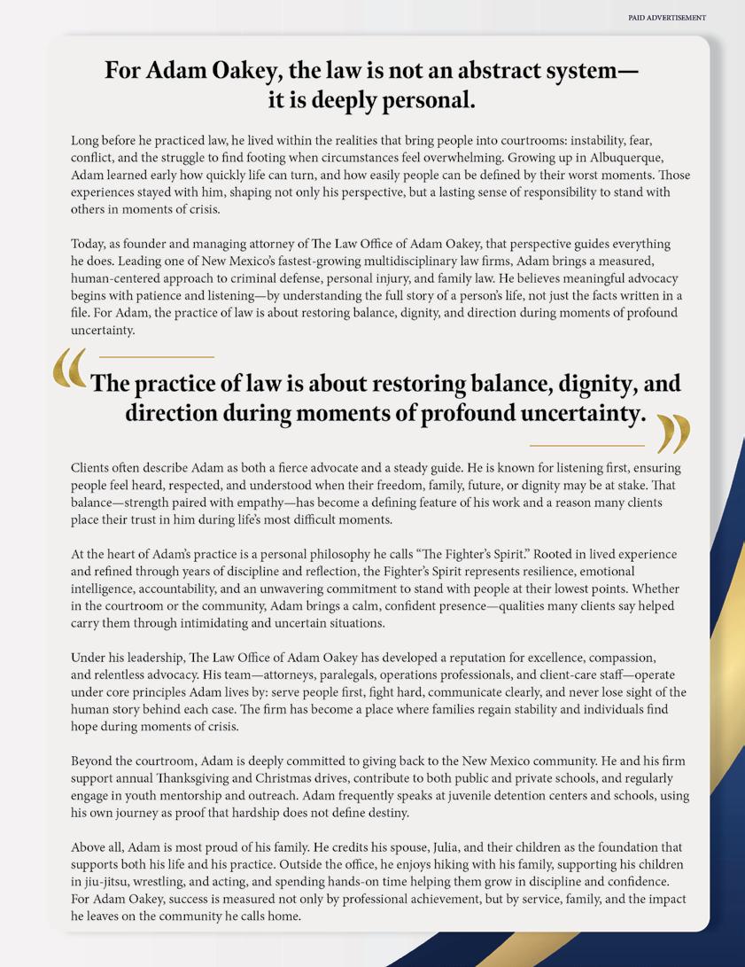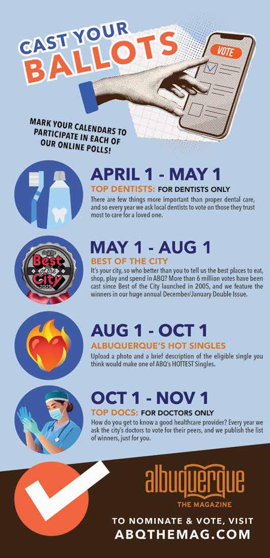 Albuquerque The Magazine (ISSN 1936-4350) is published monthly except January by Albuquerque The Media Corporation, 1550 Mercantile Ave. NE, Top Floor, Albuquerque, NM 87107. Periodicals Postage Paid at Albuquerque, NM 87101, and at additional mailing offices.