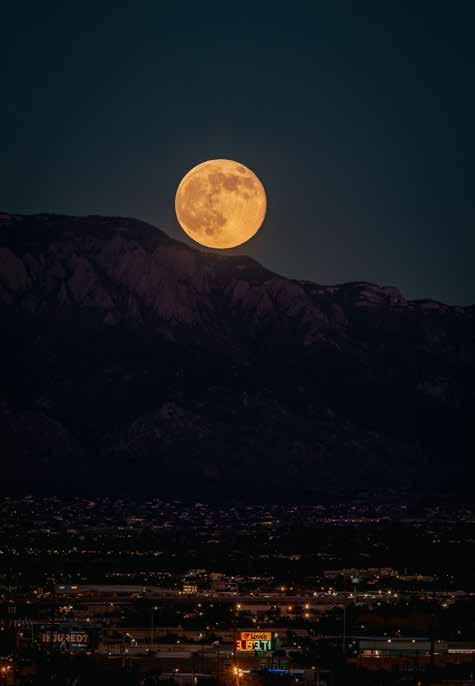 “The Sandias kind of give the moon this stage,” he says. “And depending on the elevation of the mountains and where it’s rising, or even depending on the season, it has this grand reveal.”