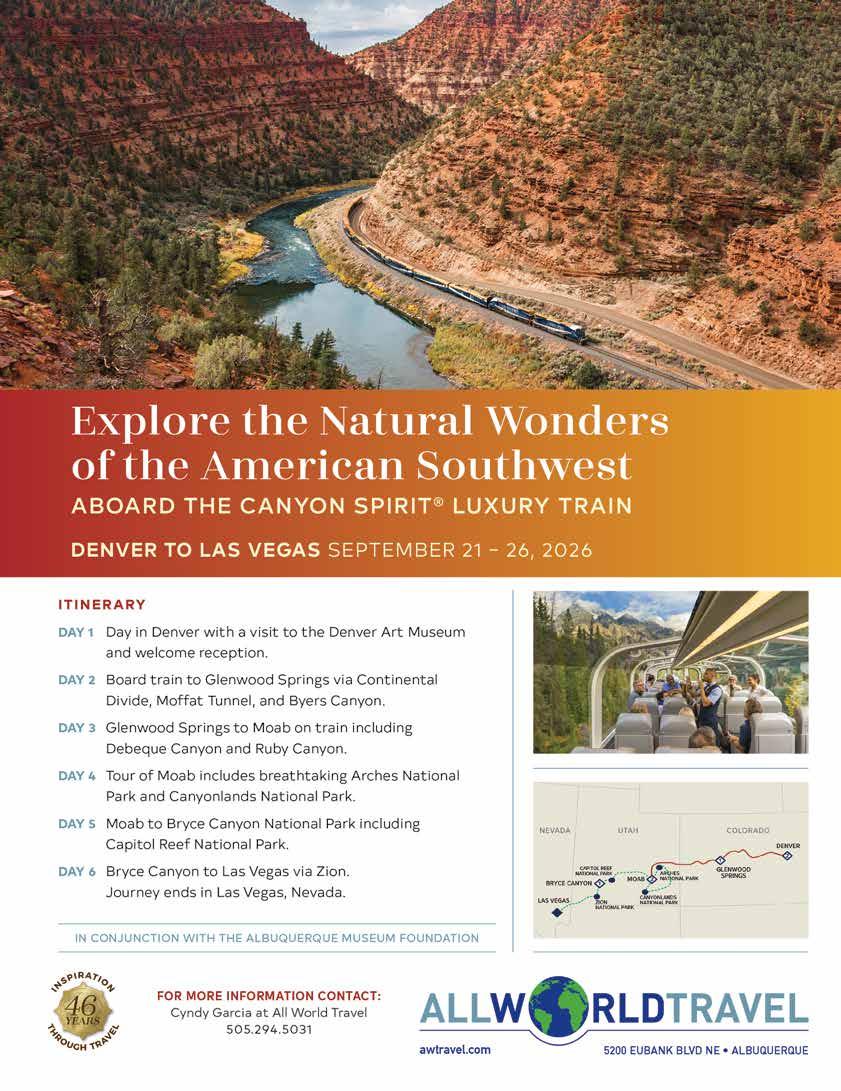 Meyers encourages readers to be on the lookout for opera nights in 2026—back for its second year after a wildly successful first. “It’s a full package where passengers can take the train, get off at the depot in Santa Fe, and get a shuttle to the opera and back,” she says. For tickets and more information, hop on over to riometro. org to take advantage of all the wonderful things that the Rail Runner has to offer. —AS