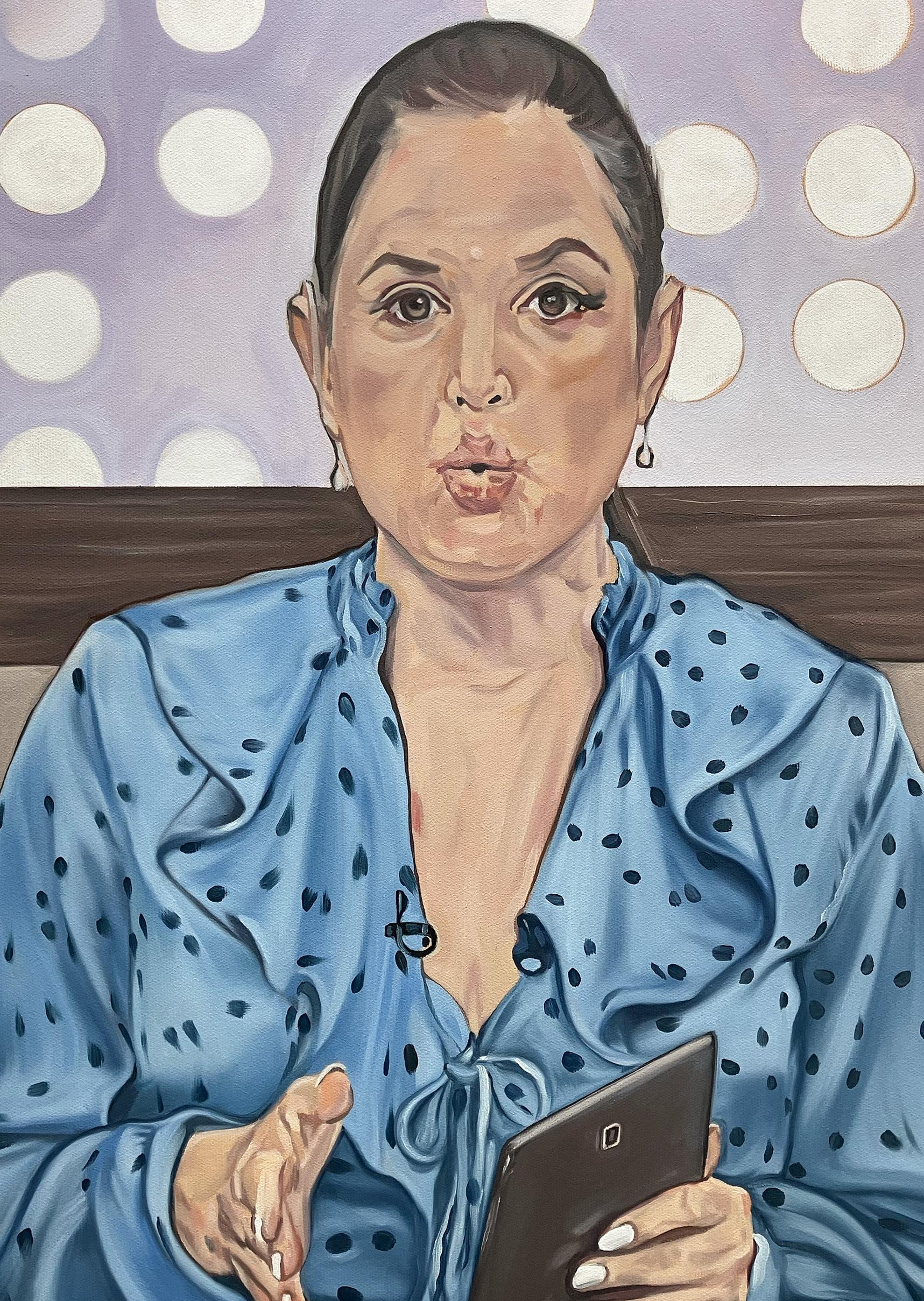 imágenes las manipula digitalmente. Y en algunas pocas piezas, la reconfiguración se centra en el desplazamiento de la imagen “original” hasta su traducción en la pintura. Así sucede con Un caso de histérica ceguera histórica (o la masculinización de la política) (2025), que parte de la captura de un registro de una transmisión televisiva, lo que Hito Steyerl denominaría una “imagen pobre”; una copia en movimiento, trasladada y reciclada, pero de amplia circulación. 4