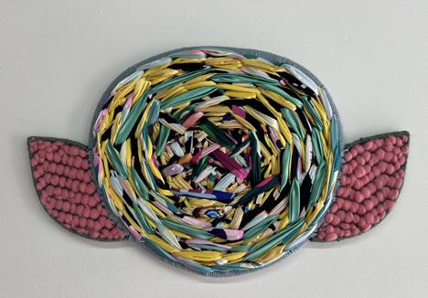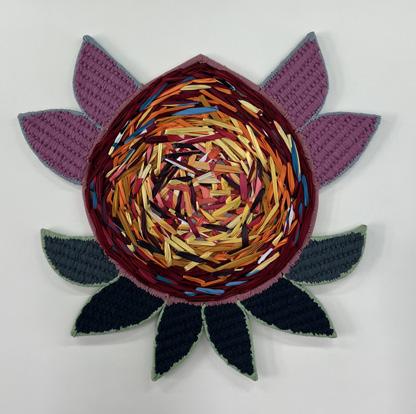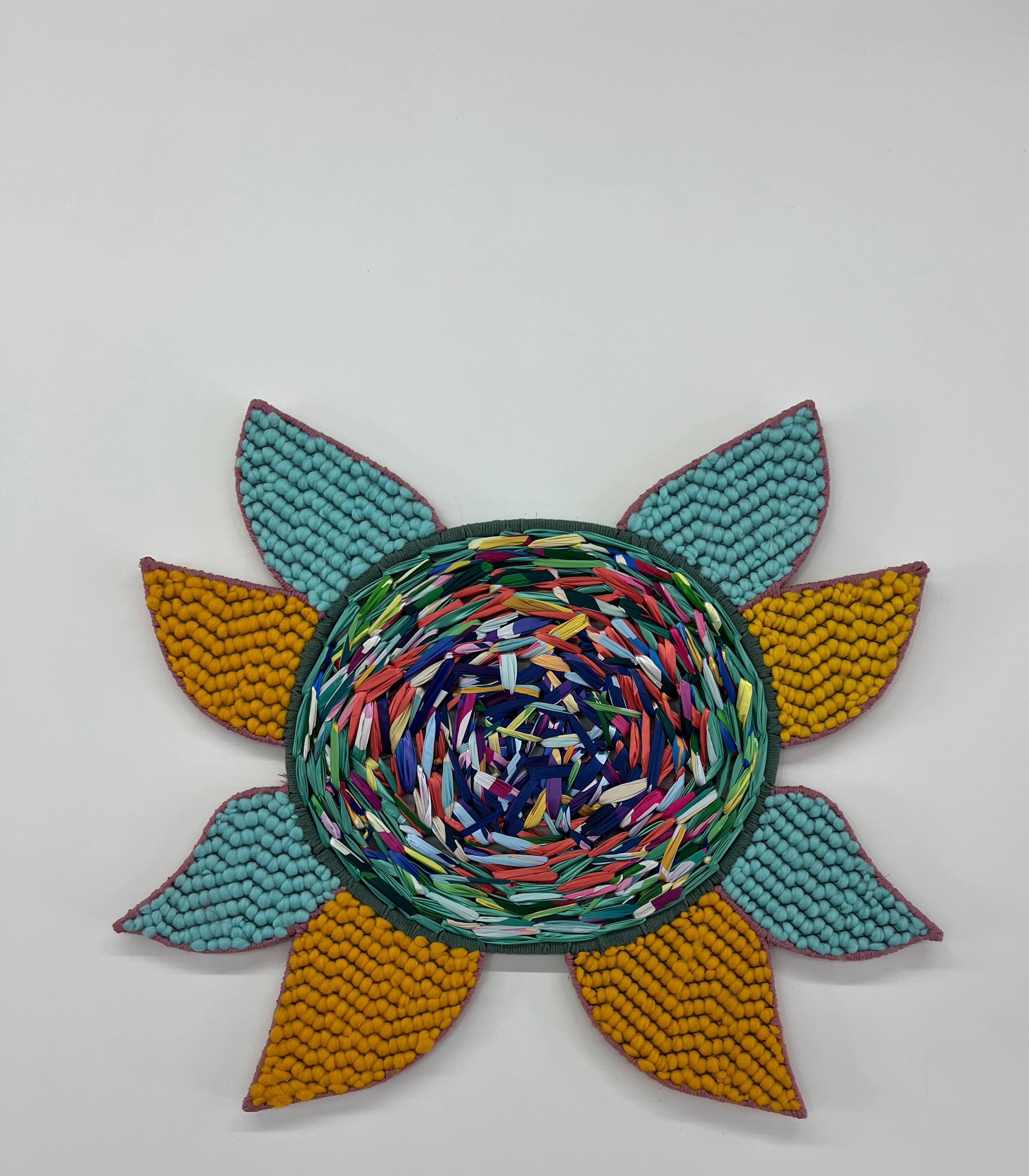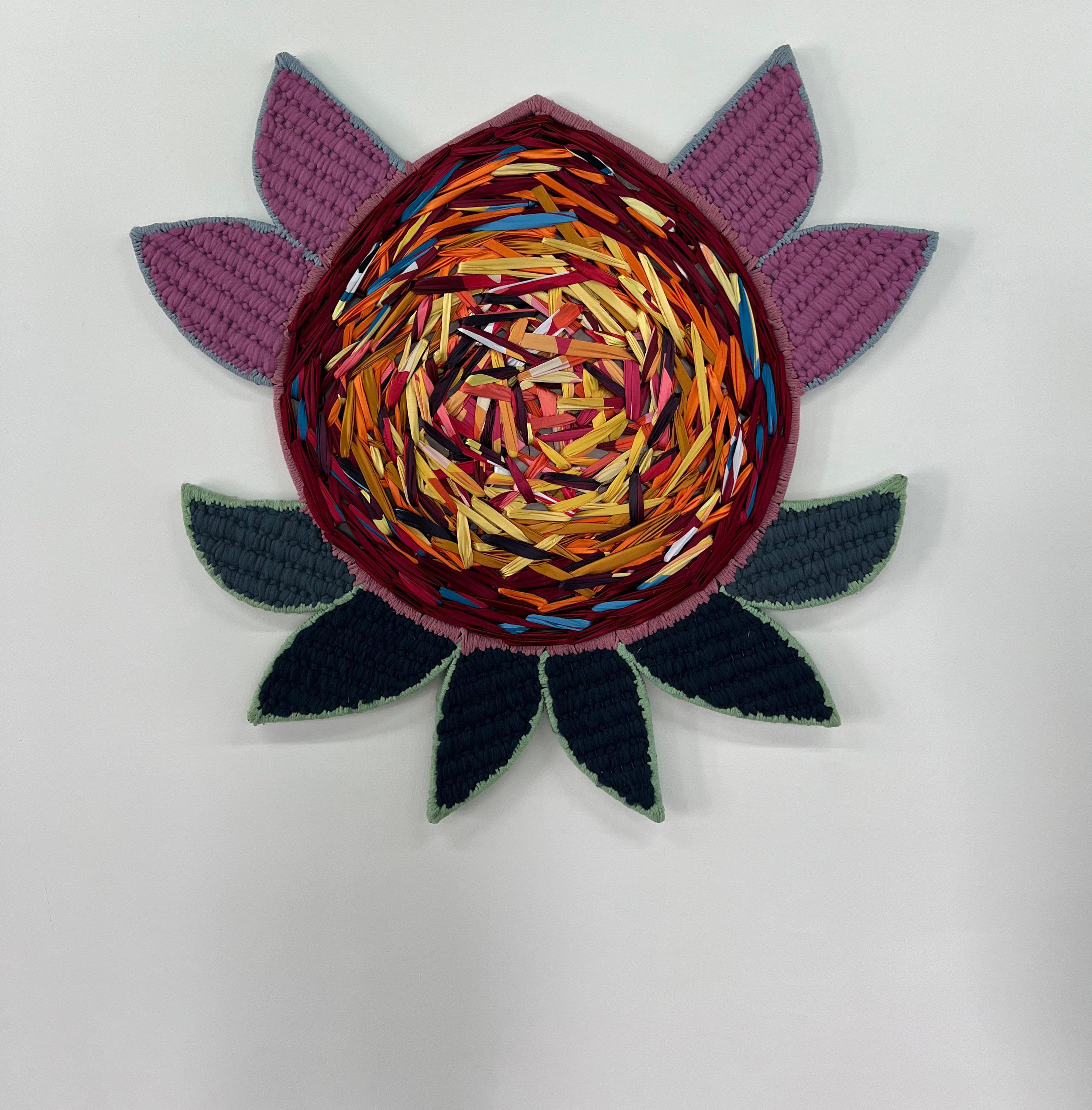 El artista también traduce su lenguaje pictórico al ámbito textil, reutilizando nuevamente los retazos de telas que previamente formaron parte de los vestuarios que usaba en sus performances. Tal como ocurre en sus pinturas abstractas, entrelaza colores generando dimensiones táctiles que, en este caso, se adhieren a un soporte de metal con forma de flor.