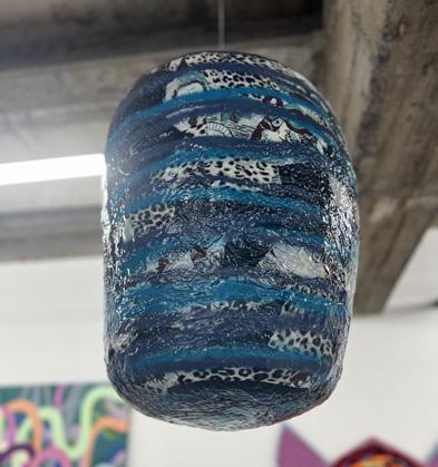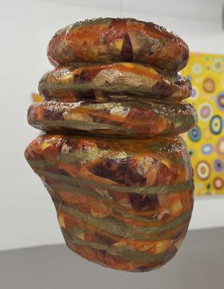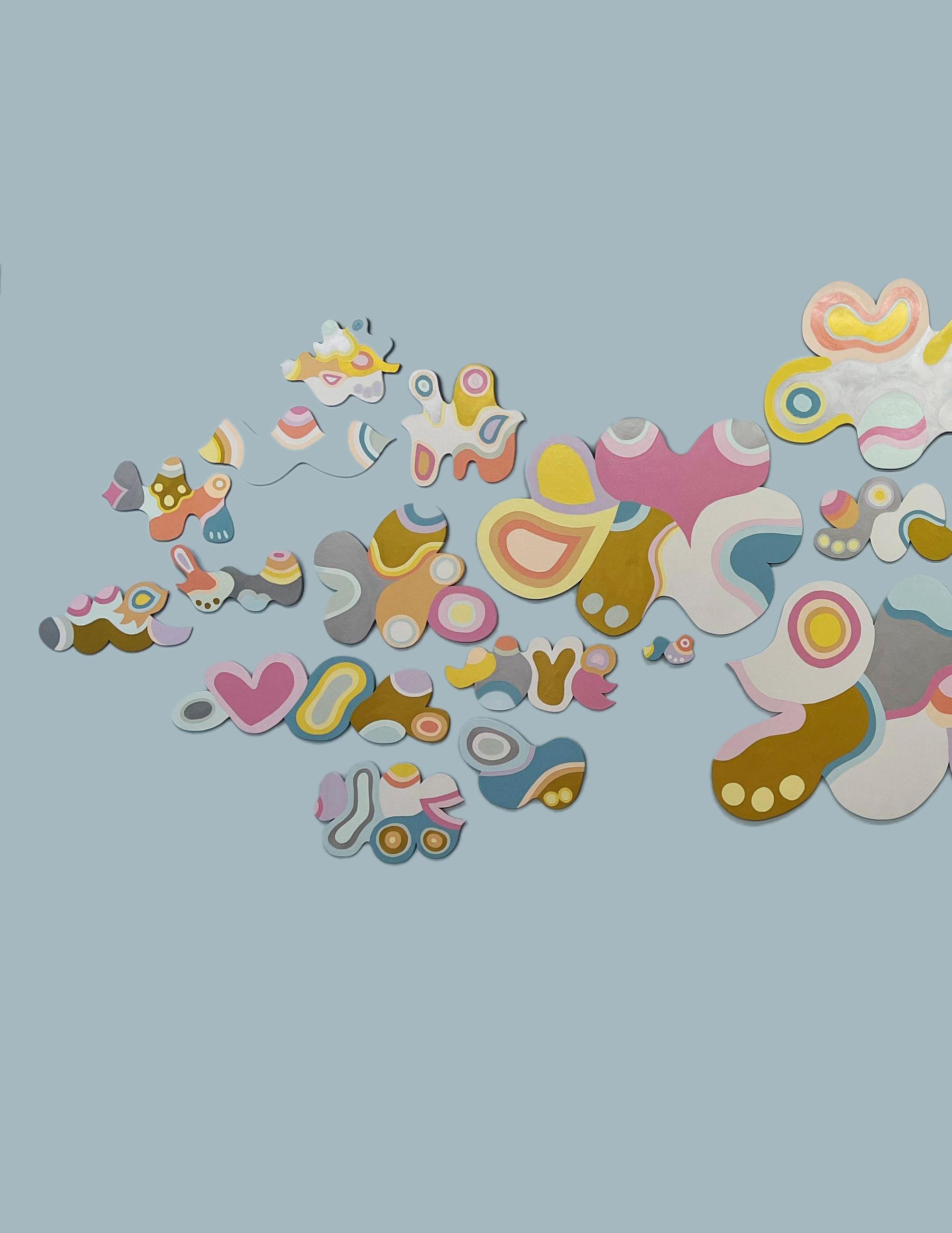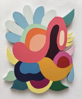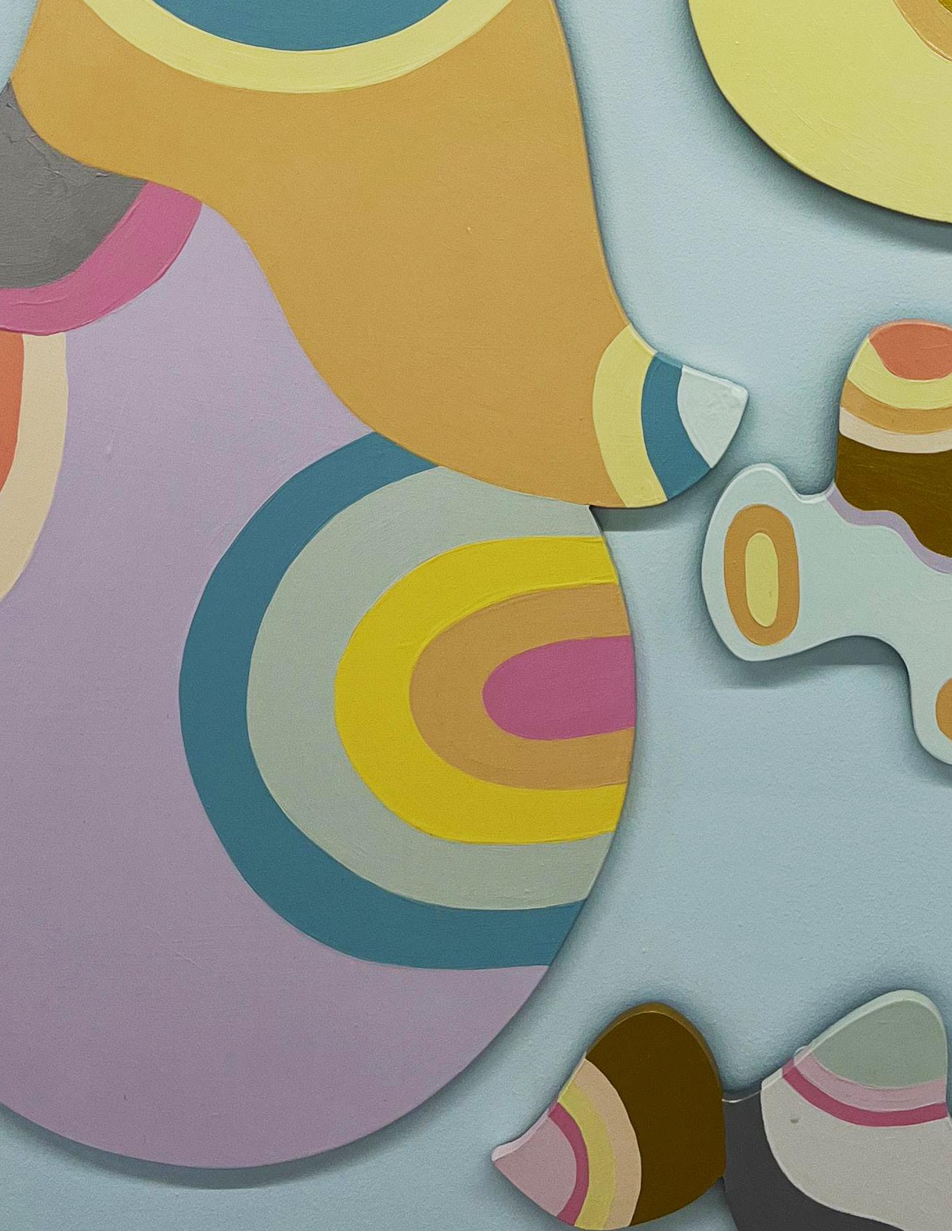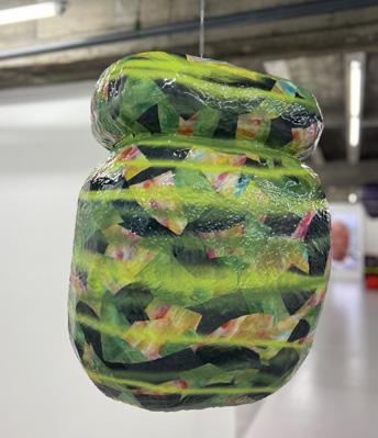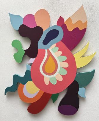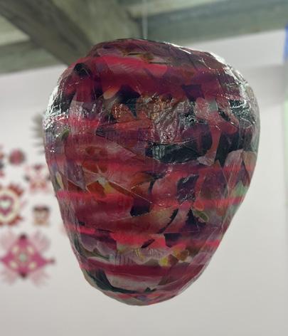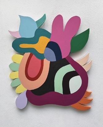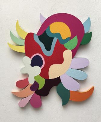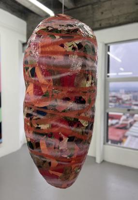 En sus pinturas, Dino trabaja de forma intuitiva, agregando capas de acrílico, pintura en aerosol y óleo. Cuando lleva su proceso al terreno tridimensional, integra pintura y retazos de telas estampadas con diseños propios en composiciones tipo collage sobre estructuras que evocan capullos colgantes: envolturas de protección en medio de la transformación.