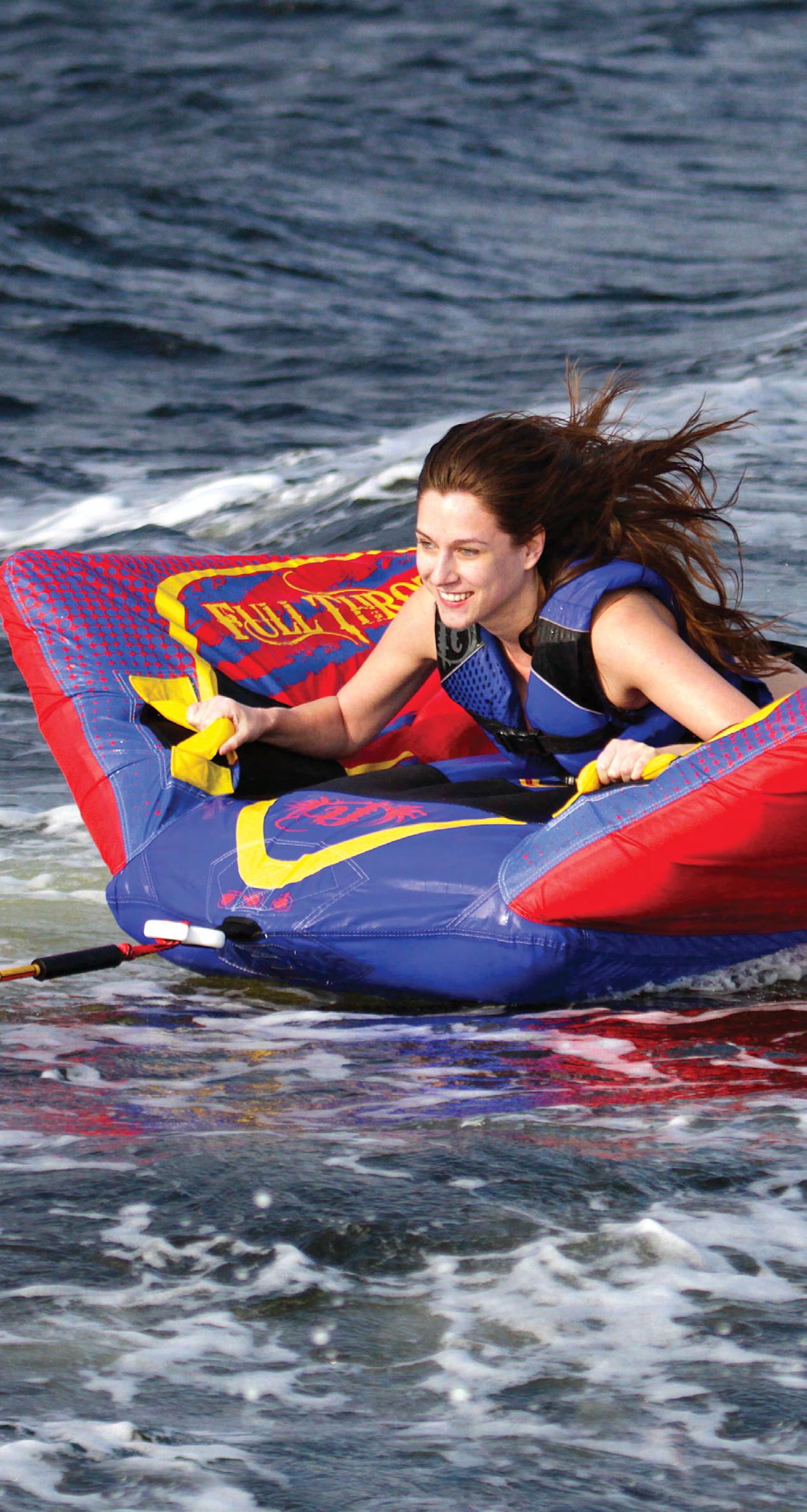 Included on all Full Throttle Tubes, our E-Z Connect towing harness allows for convenient hook-up. Slide rope through, loop rope around, pull rope through.