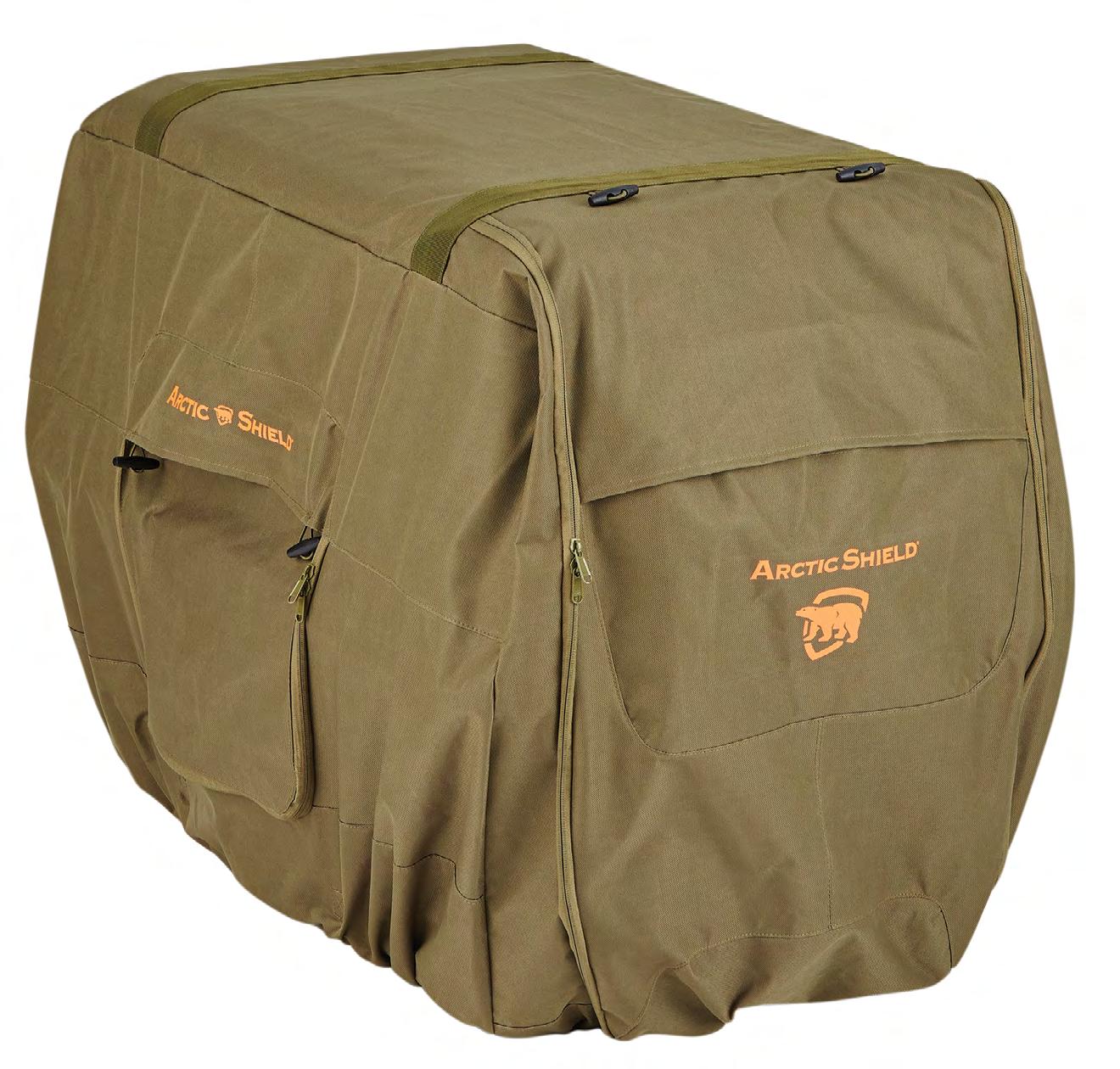 . Zippered, vented side windows and zippered main door roll up and secure with toggles/elastic loops