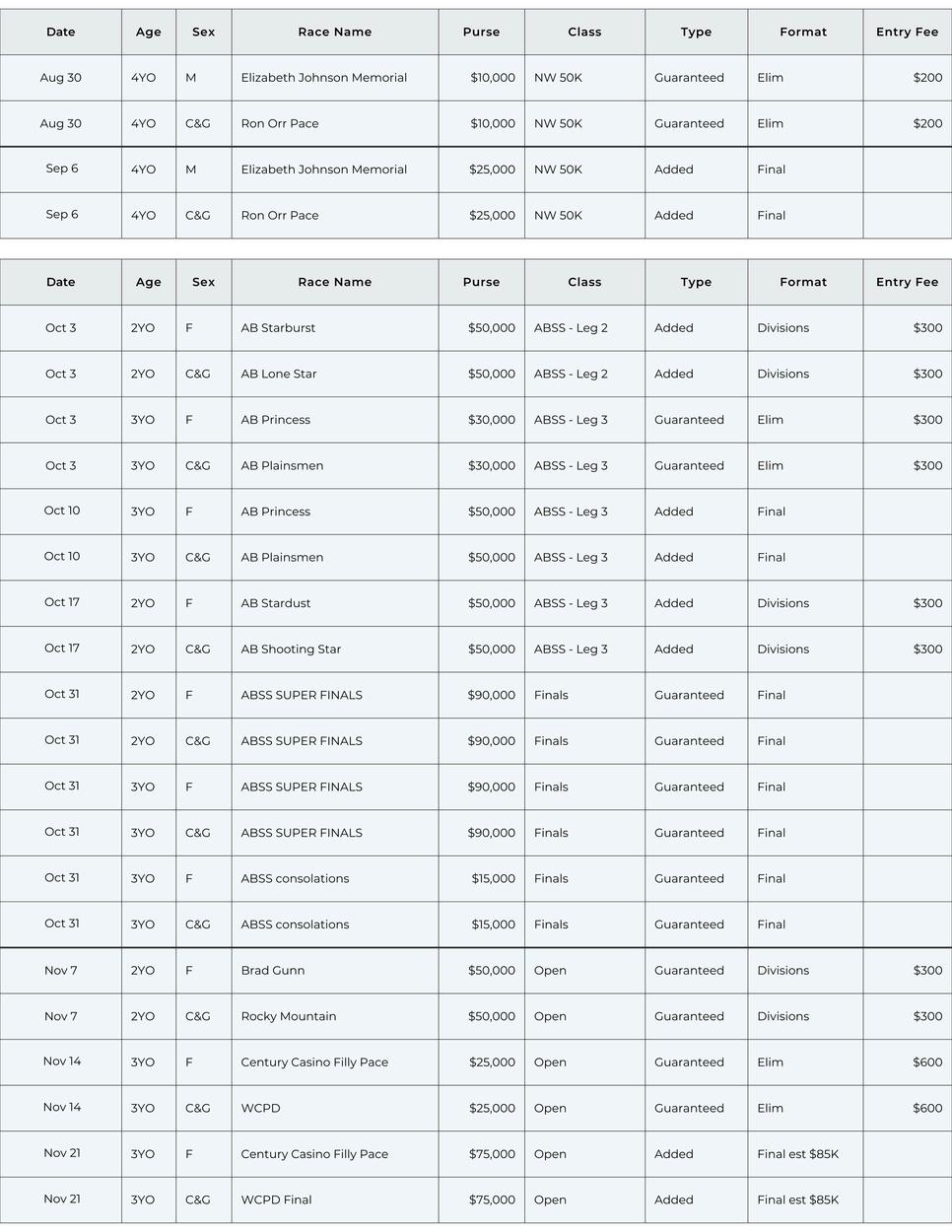 Top nine (9) money winners of ABSS legs 1, 2 and 3 are eligible for the Alberta Super Finals to be raced October 31, 2026, at Century Mile Racetrack and Casino.