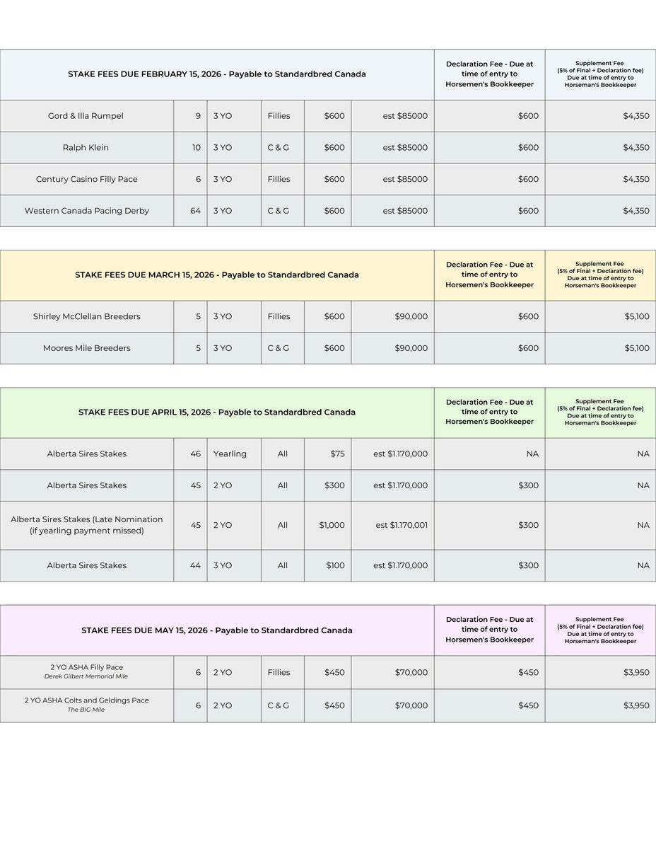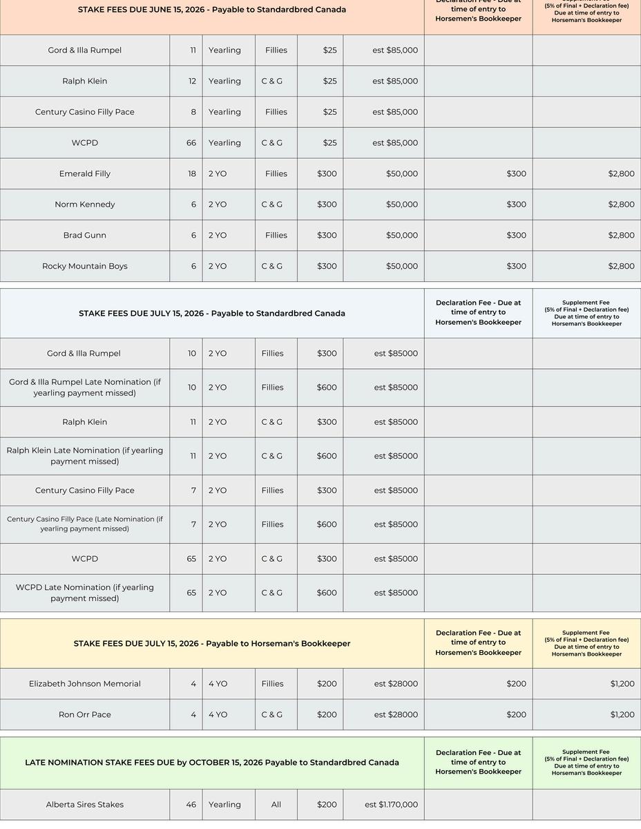 Events are subject to change without notice or liability. Governed by Horse Racing Alberta Rules and Directives. All nomination and sustaining payments are paid to Standardbred Canada - Stakes Dept Payments must be sent via registered mail, courier, or electronically to ensure timely delivery. Postmark or electronic receipt by midnight MT on the due date is required (excluding weekends and holidays).