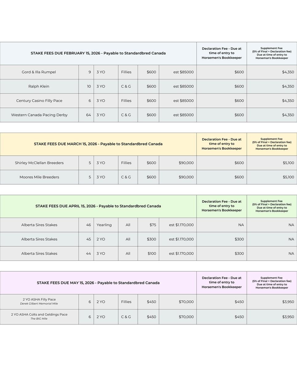 All nomination and sustaining payments are paid to Standardbred Canada - Stakes Department