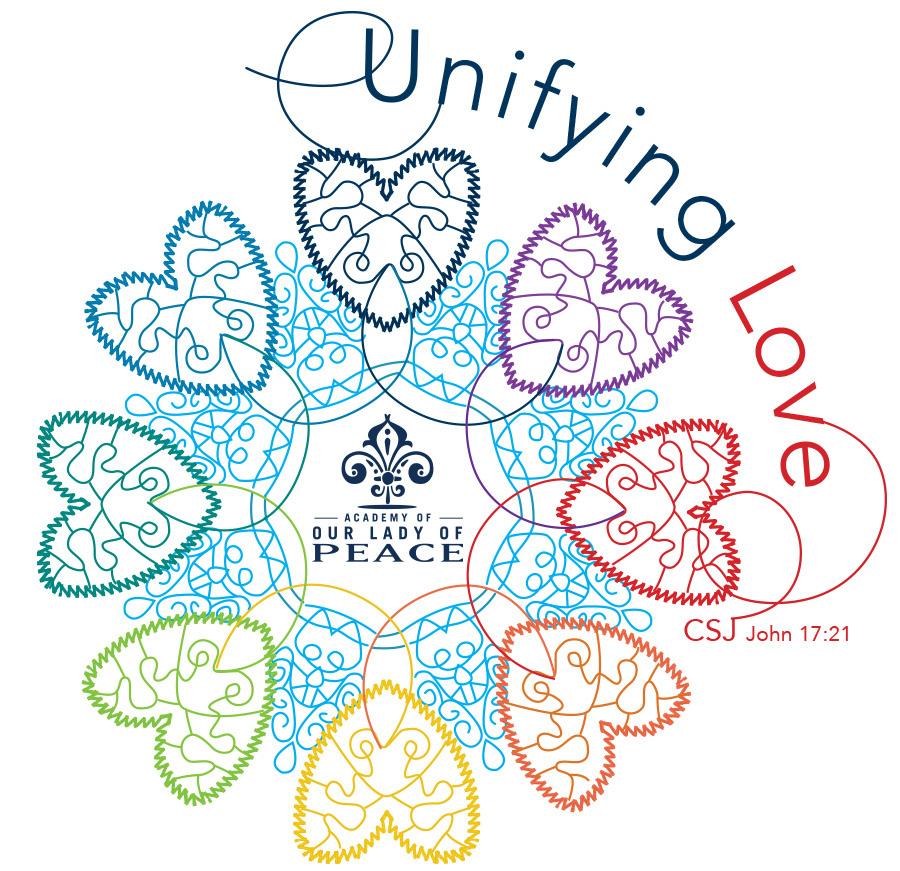 At OLP, our community makes space for each of our individual identities and teaches us to provide the welcoming culture of belonging for all. As we live out the CSJ principles within our Catholic high school community, we feel it important to anchor ourselves to an integrated symbolic representation of our Sisters’ culture that welcomes all within the heart of its message. The CSJ began with teaching women the art and skill of lacemaking; and as you look at the imagery of what we call our unifying love logo, consider yourself a thread within the beautiful product of the whole, the lace. A thread that thrives in its singular identity, yet is wholly connected to the bigger picture, and thus integral to the completed beautiful design. It is our hope that through this symbolism, each student, employee and guest to campus will feel the culture of belonging that is inherent within our school community.