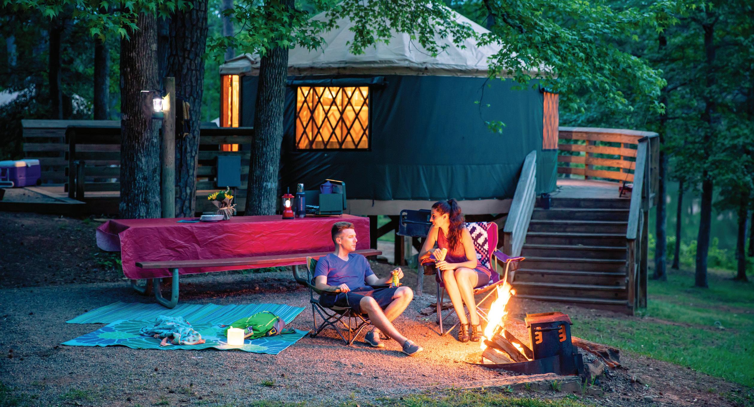 Ten quaint bungalows, each with their own fireplace and screened porch, sit along the banks of the lake where paths lead onto the marina, restaurant, conference center, picnic pavilions, and other resort/ park amenities.