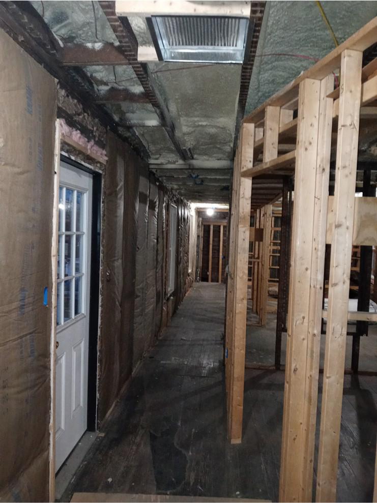Significant work has already been completed in many of the buildings including. See Appendix B for Before and After photos of various areas of the property as well as floor plans, and future building renderings. Completed Renovations: Main Building. Renovations in the main building included all new electrical wiring, new windows, and fire safety exits. In addition the following areas were renovated with new flooring, repaired walls, paint, and fixtures or equipment. • Commercial Kitchen