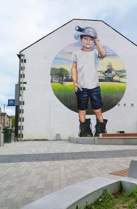 Until recently, Cowdenbeath’s most obvious reminder of this lost way of life was the mining subsidence for which the town was long notorious – apparent even in the High Street, where the once level roadway now has a pronounced dip. But since 2017 this same street has boasted a much more welcome memorial, in the form of a huge gable-end painting commissioned by the Community Council as part of a town centre improvement scheme. Officially called the Mining Heritage Mural, it’s more familiarly known to artist Kerry Wilson as the Wee Miner Boy – despite being the biggest painting in Fife.