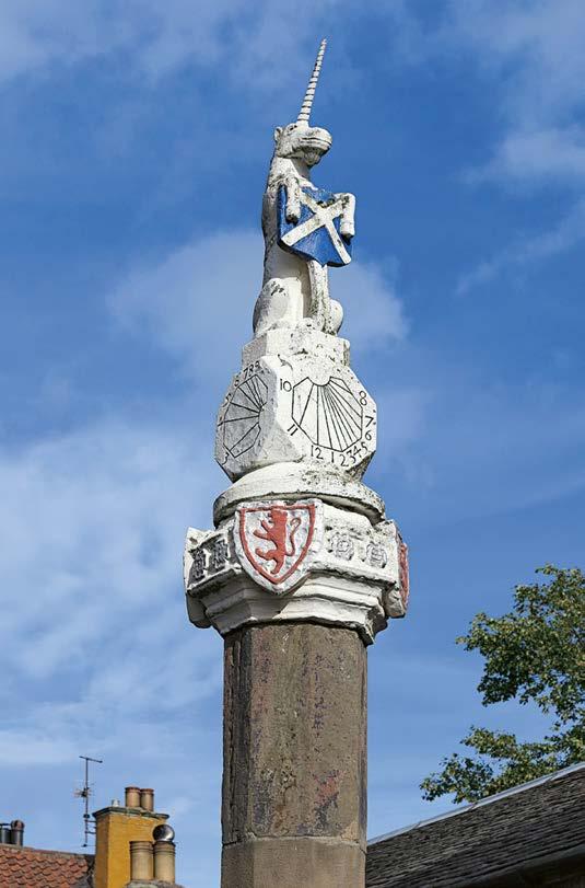 It remains to be proven whether the roots of Inverkeithing date back as far as the Roman general Agricola’s anti-Caledonian campaign of ad 84, but what is certain is that by the mid-12th century the community was sufficiently established to be granted a royal charter as a burgh. At the heart of all burghs was the mercat (market) cross, a status symbol indicating an official place for trading goods, as well as a focal point for townsfolk to witness proclamations, celebrate holidays and join in the popular entertainment of tormenting miscreants. Inverkeithing’s is one of the finest in Scotland, and in 2025 the long-neglected monument was restored and moved to a prominent new site. A replacement for an earlier wooden column, it was erected around 1400 courtesy of Robert III’s queen consort Annabella Drummond, who often resided in the town. (Annabella had been de facto ruler of the country since a riding accident had left the king a depressive invalid, who declared that he wanted only to die and be dumped in a dung-heap.) In 1688, year of the ‘Glorious Revolution’, the crucifix that had previously formed the cross’s finial was symbolically replaced with a carving of a perky unicorn – the heraldic animal of Scotland – squatting on a faceted sundial. Our infantilising 21st-century culture has reduced this proud, untamed creature of myth to a pastel-shaded, long-lashed, simpering soft toy. But the unicorn was then a fierce and noble beast, strong, swift, pure and the natural enemy of the lion – symbol of England.