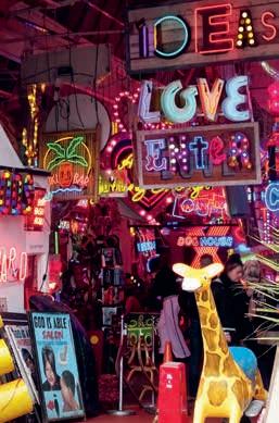 Walthamstow lies far out in the north-east of Greater London, but the trip takes only 20 minutes from the West End by Tube, and is rewarded by an astonishing spectacle, an explosion of colour. The home of God’s Own Junkyard is a modest factory hall on an industrial estate. Inside the hall, every corner is crammed full of bright neon signs. Winking and flashing advertisements for restaurants, nightclubs, bars and motels adorn every wall, and are reflected in disco mirror-balls. They promise all kinds of services, from sushi to ‘beer, girls and porn’. This is not a museum, but a showroom for collectors, and thousands more examples of neon art await purchasers in storerooms. A 20-strong team of restorers puts the sparkle back into old neon signs and also makes new ones – a craft that few people master in the age of LED lighting, as it requires a great deal of skill to bend the glass tubes.