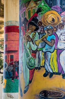 Resourcefulness, however, still existed, and residents started using the space “under the bridge” as a gathering place for parades, krewe dance rehearsals, marching band practice, crawfish boils, and barbecues. Recently, thanks to civic and cultural leaders, multiple grants, and work from various nonprofits, the space is experiencing a rebirth.With assistance from the Arts Council of New Orleans, murals of legendary cultural bearers of the city were painted down the corridor. The space is being reimagined as a market and gathering place for art, crafts, and produce as well as social services, special events, and community activities.This resident-driven effort is working toward making “under the bridge”a place that serves and enhances the neighborhood. In December 2024,a historical marker was unveiled with much fanfare,honoring the spot as a landscape of Black entrepreneurship.