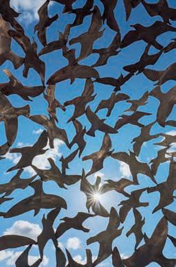 Flock Sphere is a stainless-steel globe – approximately eight feet in diameter – into which bird shapes have been laser cut. A doorway has been created in the base so that it’s possible to climb inside to view the sphere from within. From this perspective it’s easy to imagine yourself as a bird, flying as a member of a flock. As Mulholland stated in his original proposal for Flock Sphere, it ‘allows the viewer to consider their own relationship with natural world… specifically the relationship they have with the world of ornithology as they stand surrounded by the flock’.
