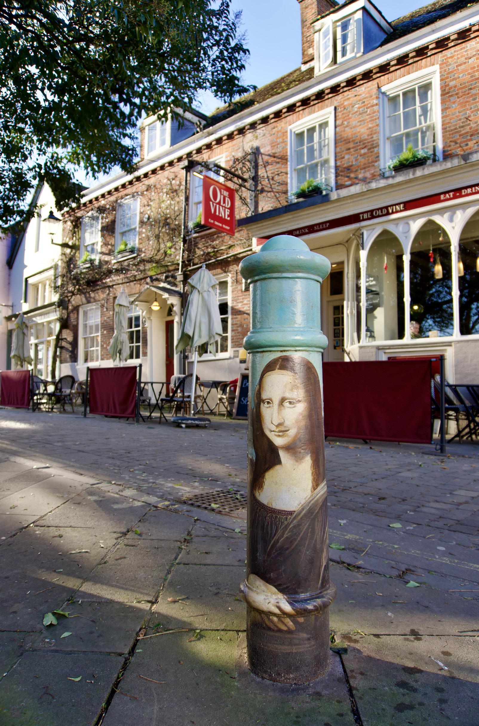 As you cross The Square, whether from the High Street towards the Cathedral or vice-versa, and look towards The Old Vine – her gaze keeps following you. Though she doesn’t move, her eyes track you wherever you stand, her mouth curled into a subtle smile – just as in the original.