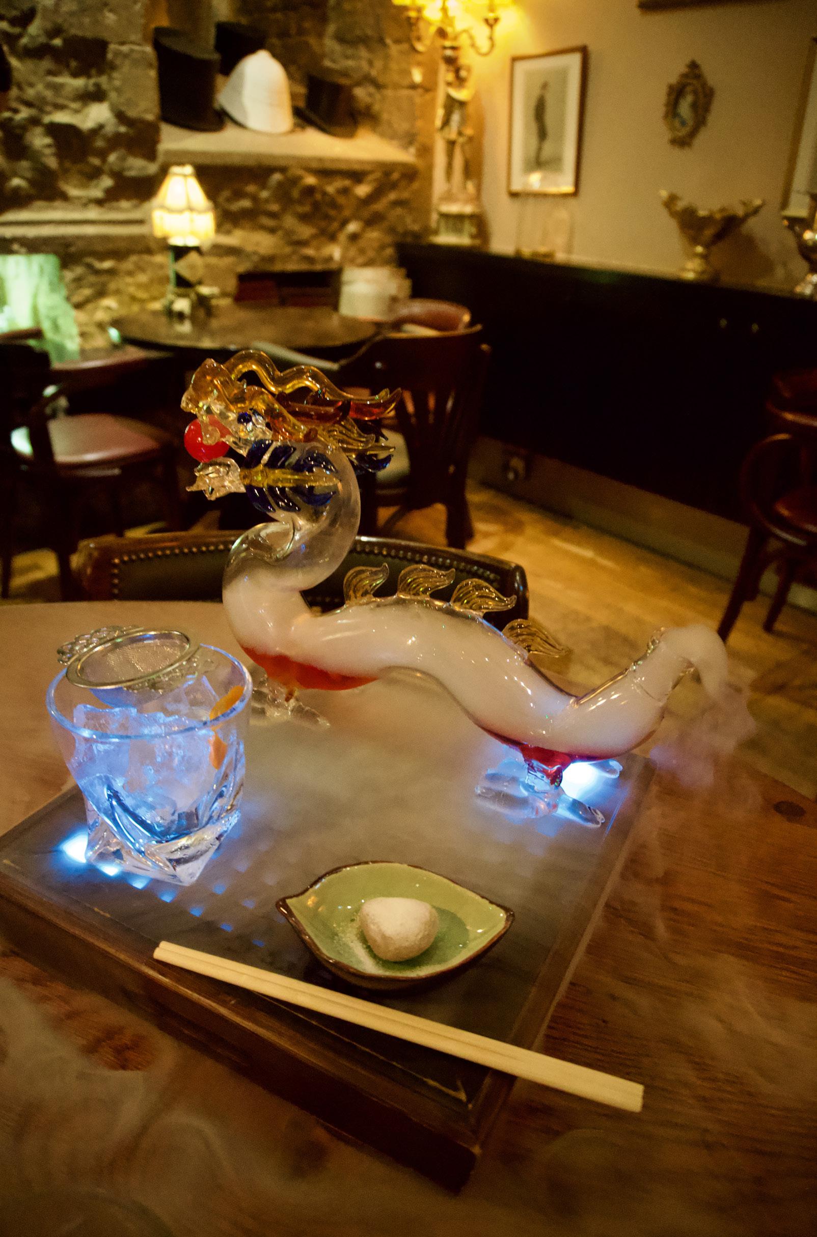 Flickering candles and the subdued light of colourful lampshades illuminate opulent gilded frames depicting Chadwick and his friends, an opulent bar and drinks so surreal you could never even have imagined them: Breakfast at Chadwick comes in a silver teapot, Along For The Ride is accompanied by a turning and blinking ferris wheel, The Holy Grail is set on fire, and Mr Chow’s Dragon doesn’t just breathe smoke – its sharp, bitter flavours leave you breathless.