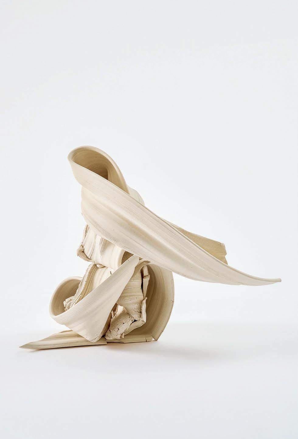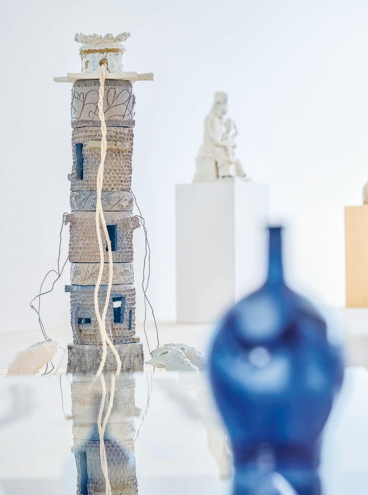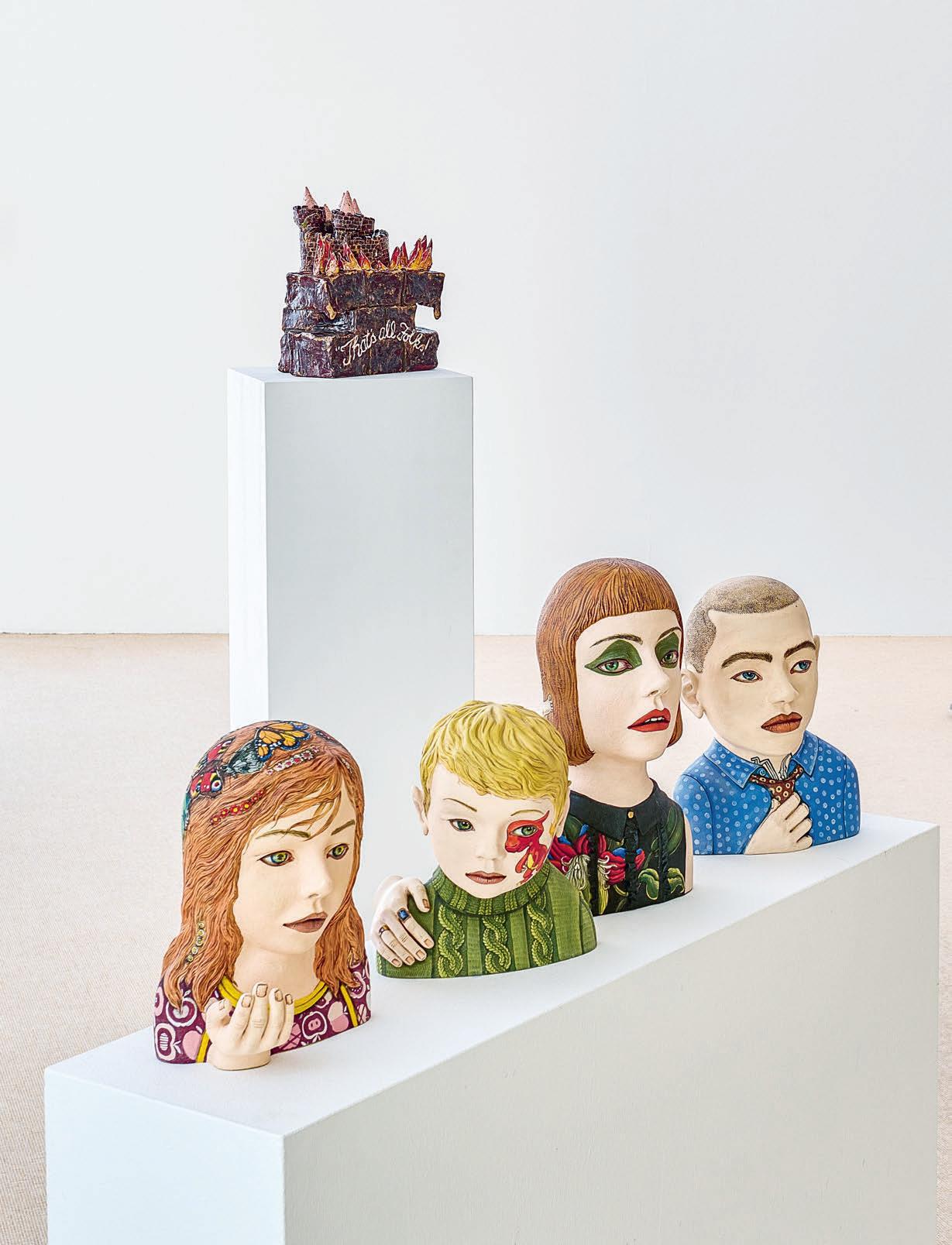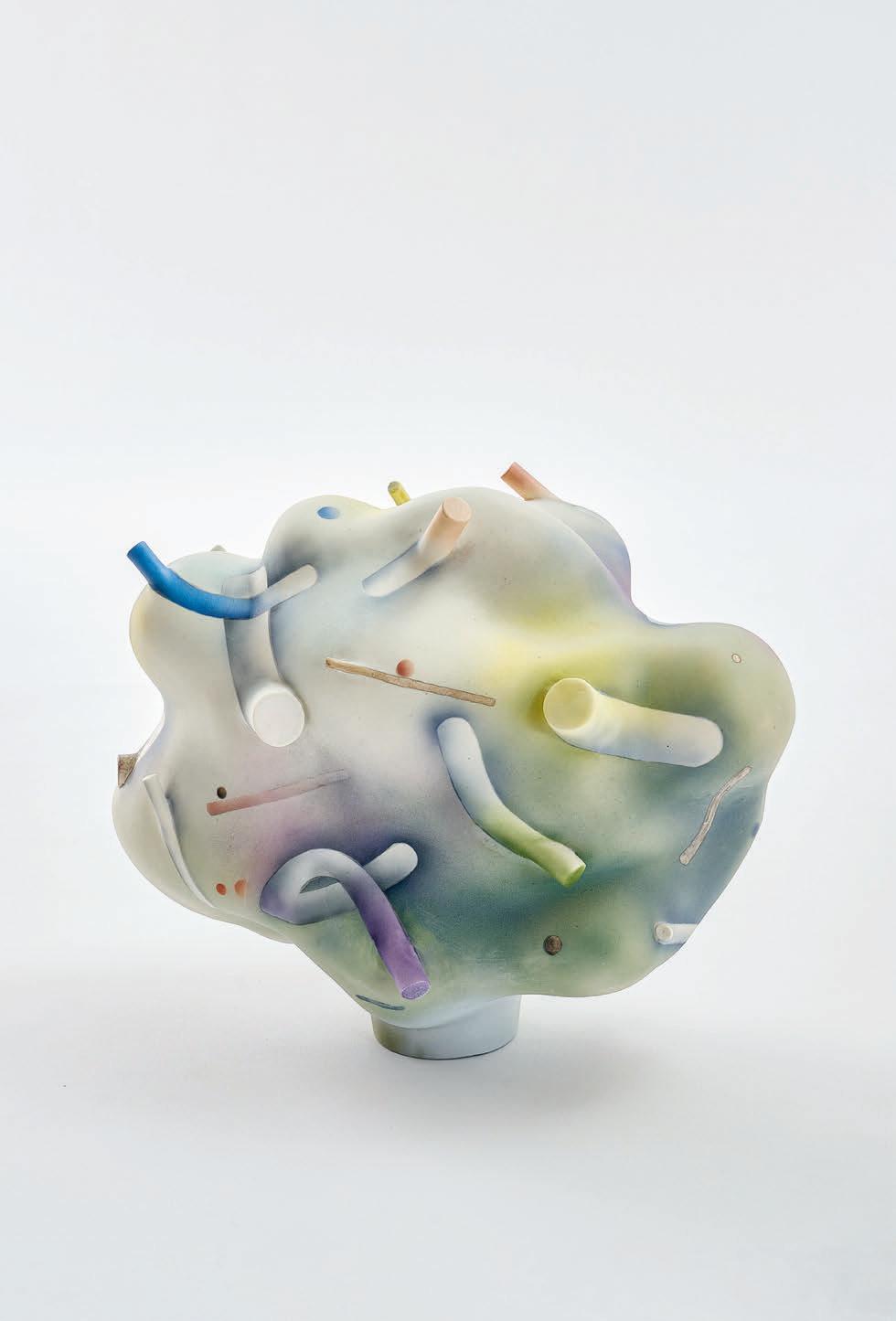Überfluss und Überlastung sind zwei Schlagworte für Nora Arrietas Werk Toteninsel. Eine tätowierte Hand, eine gepiercte Zunge, mehrere Kinderroller, einige Schuhe, Gesichter und Handys ragen aus der dunklen Masse heraus, die den Kern der Skulptur bildet. Darauf steht eine Pferdefigur mit einem vergoldeten Sattel und einer Einhornmaske. Dies sind nur einige der Gegenstände, die in und aus diesem keramischen Füllhorn wimmeln. Dazwischen angebrachte Abziehbilder erinnern uns an die zentrale Funktion von Bildern in der heutigen digitalen Medienrealität. Überfluss steht sowohl für die Überproduktion von Waren in der heutigen Wegwerfgesellschaft als auch für den Bilderstrom in den sozialen Medien. Hier setzt die Überlastung an. Eine große grüne Schere, die im Begri ist, ein Mobiltelefon in zwei Hälften zu schneiden, symbolisiert den Wunsch, den ständigen Strom zu stoppen. Arrietas Skulptur fängt die Gegenwart eindrücklich ein und verweist gleichzeitig auf die Geschichte der Keramik. Ihre Form gleicht einer antiken Vase, ihre Opulenz erinnert an reich verzierte Meissener Vasen des 18.Jahrhunderts. Während die Meissener Gefäße hell und üppig sind, ist die von Arrieta dunkel und düster. Nur der Sockel ist mit grünen, knospenden Formen und Darstellungen von Pflanzen und Tieren gefüllt. Der Titel Toteninsel unterstreicht die Düsterheit und erinnert an Arnold Böcklins berühmtes gleichnamiges Gemälde von 1880. Sein dunkles und geheimnisvolles Gemälde wird oft als Allegorie des Todes interpretiert. Arrietas keramische Skulptur ist mehrdeutiger. Auch wenn es als eine Geschichte des Untergangs gedeutet werden kann, wird das Chaos mit Humor und einer großen Portion Verspieltheit dargestellt.