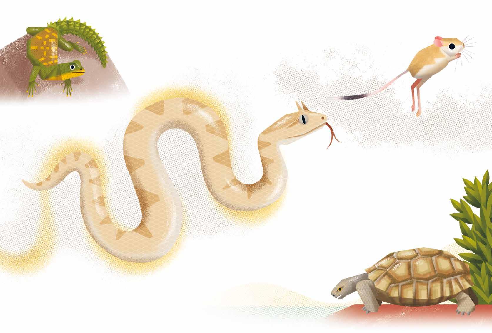 Crawling on the hot sand of the desert is not easy; for this reason, the Sahara sand viper makes sure that at any moment, only two points of its body touch the ground. The result is an oblique “wave” movement.