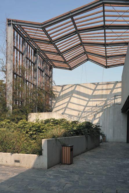 But this is not a simple solid wall. A layer of wood trellises parallel to an inner concrete wall makes the “wall” appear light and ever-changing. At the west end, the trellis layer deviates from the concrete wall and forms a unique gesture, nodding to the nearby lake shore.