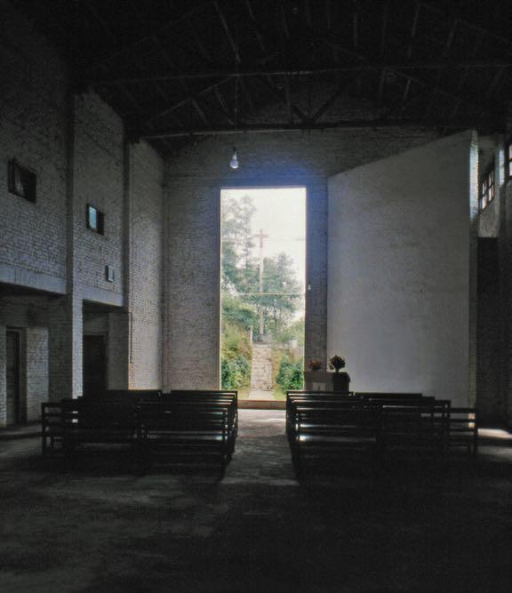 The “gate” leading toward the exterior cross and the diagonal wall separating the worship space from the foyer.