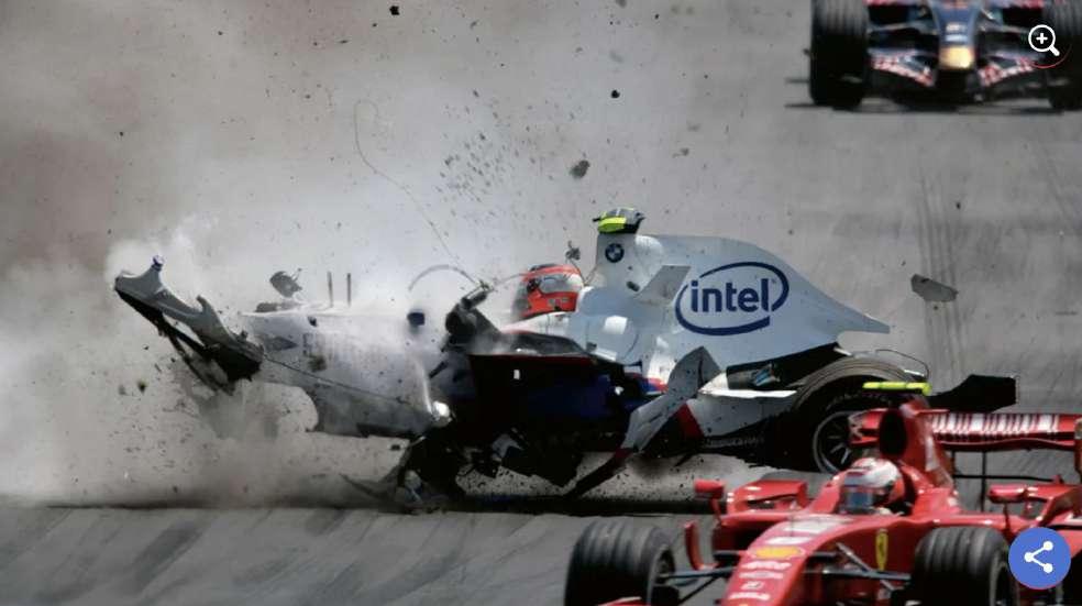 Racer Robert Kubica in the middle of his lap 26 crash at the 2007 Canadian Grand Prix, which amazingly left him with only a sprained ankle and a concussion.