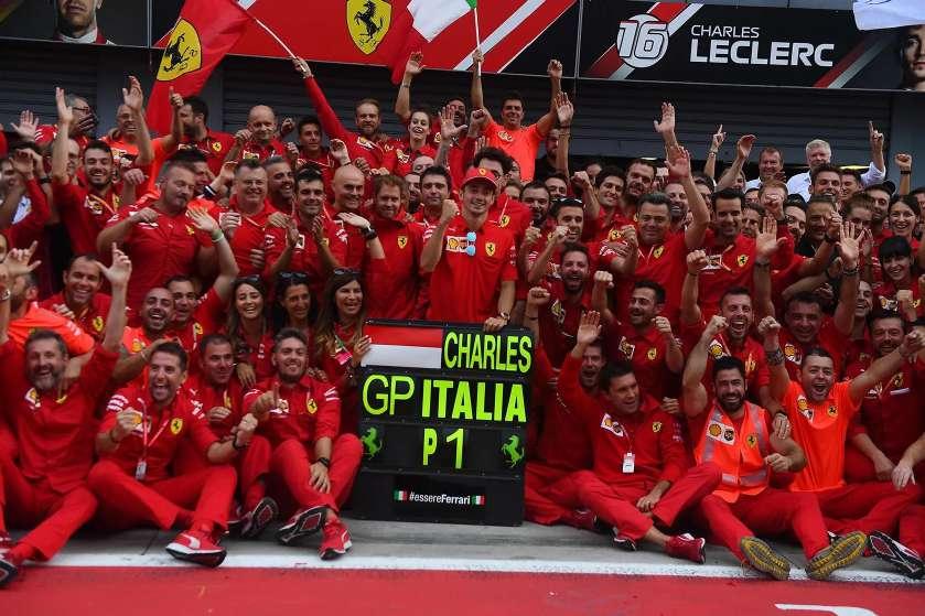 Charles Leclerc celebrates his race victory after the 2019 Italian GP.
