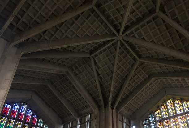 3. 4. Interior views of the cathedral showing the expressive concrete structure.