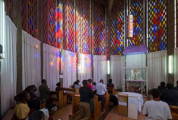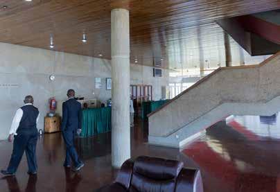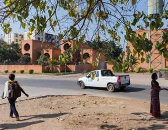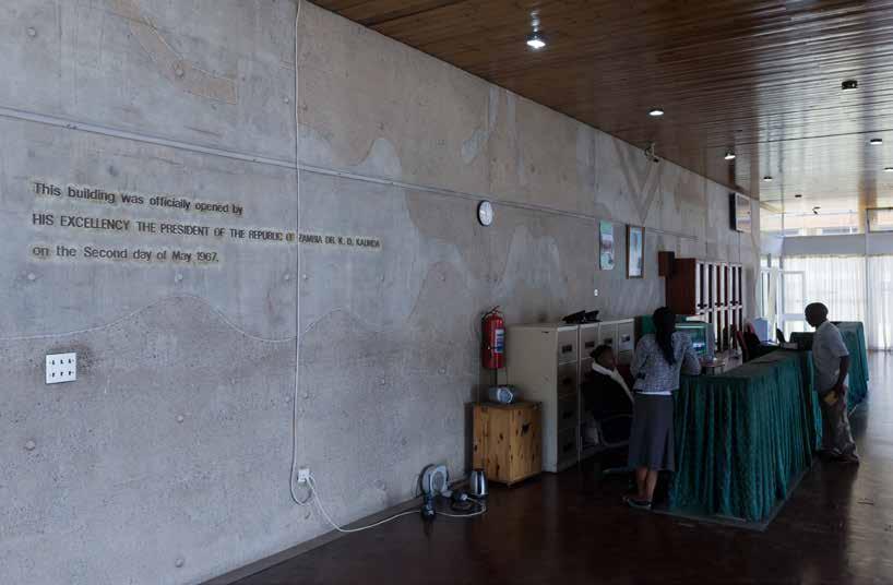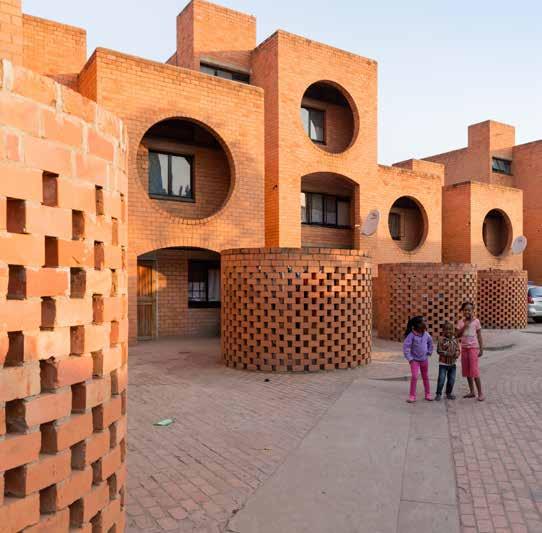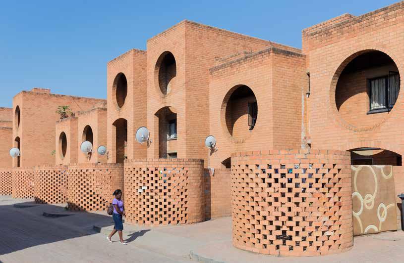 which is either employed conventionally to form walls, or as a lattice screen to create courtyards, partially exposed to the public space. The use of brick has a certain tradition in Zambia and this project shows novel ways for its application and use. The upper floors feature large circular openings that act as a shading device to the windows behind and bring to mind Louis Kahn’s Indian Institute of Management in Ahmedabad, built in the early 1960s. Nevertheless, in sculptural quality, architectural detail, and creation of public space it is one of the finest examples of housing estates that can be found in Zambia.